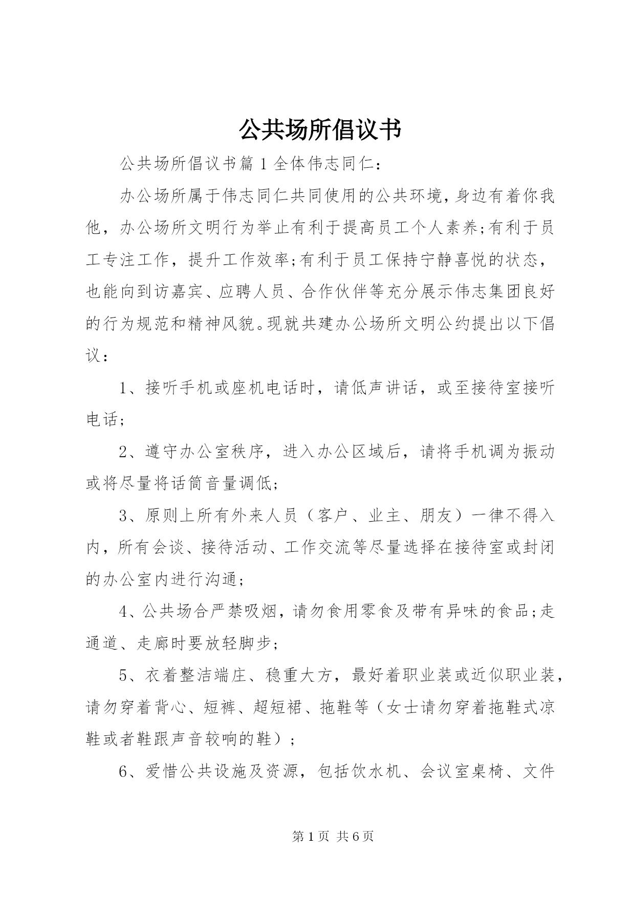 第PAGE\*Arabic\*MERGEFORMAT6页共NUMPAGES\*MERGEFORMAT6页公共场所倡议书公共场所倡议书篇1全体伟志同仁:办公场所属于伟志同仁共同使用的公共环境,身边有着你我他,办公场所文明行为举止有利于提高员工个人素养;有利于员工专注工作,提升工作效率;有利于员工保持宁静喜悦的状态,也能向到访嘉宾、应聘人员、合作伙伴等充分展示伟志集团良好的行为规范和精神风貌。现就共建办公场所文明公约提出以下倡议:1、接听手机或座机电话时,请低声讲话,或至接待室接听电话;2、遵守办