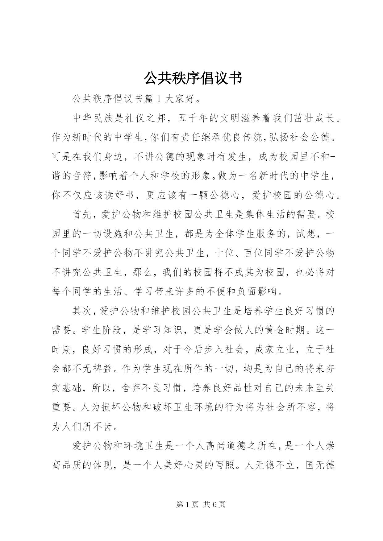 第PAGE\*Arabic\*MERGEFORMAT6页共NUMPAGES\*MERGEFORMAT6页公共秩序倡议书公共秩序倡议书篇1大家好。中华民族是礼仪之邦,五千年的文明滋养着我们茁壮成长。作为新时代的中学生,你们有责任继承优良传统,弘扬社会公德。可是在我们身边,不讲公德的现象时有发生,成为校园里不和-谐的音符,影响着个人和学校的形象。做为一名新时代的中学生,你不仅应该读好书,更应该有一颗公德心,爱护校园的公德心。首先,爱护公物和维护校园公共卫生是集体生活的需要。校园里的一切设施和公共卫