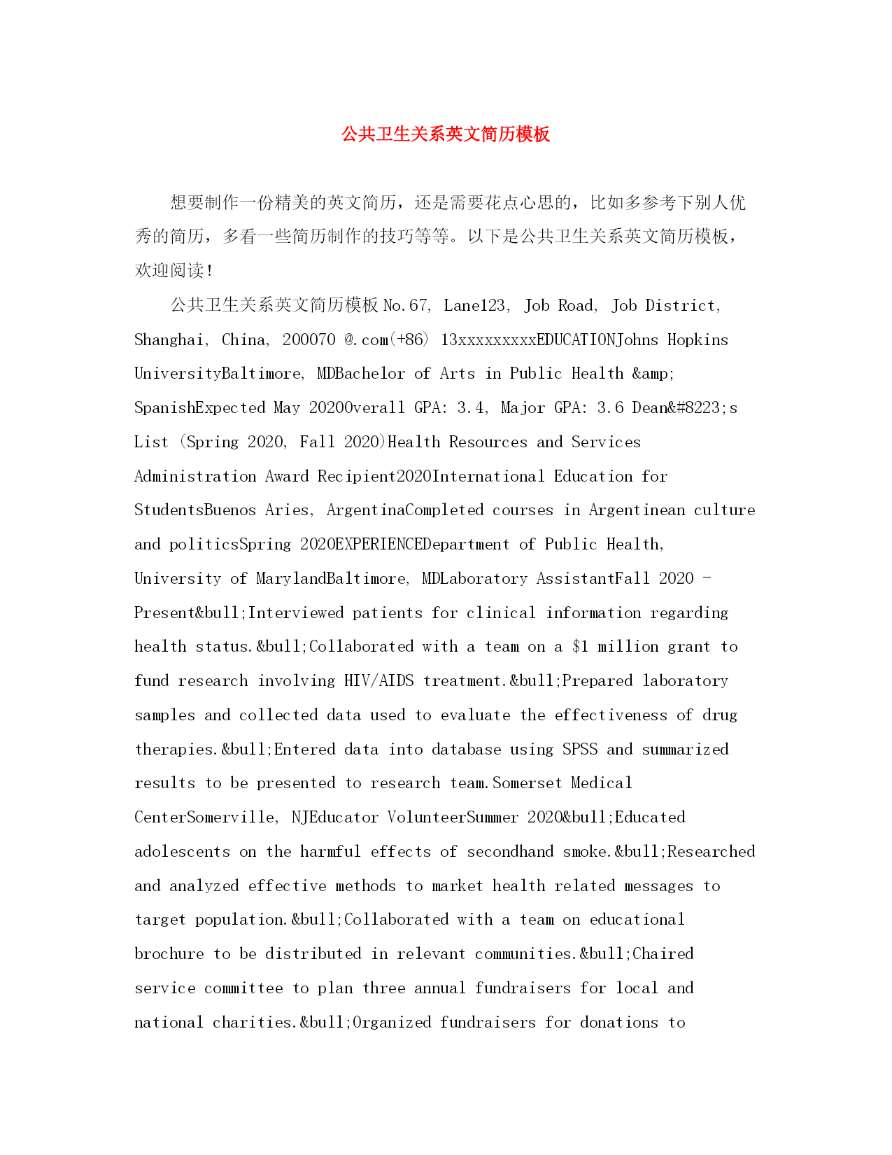 此资料由网络收集而来,如有侵权请告知上传者立即删除。资料共分享,我们负责传递知识。公共卫生关系英文简历模板想要制作一份精美的英文简历,还是需要花点心思的,比如多参考下别人优秀的简历,多看一些简历制作的技巧等等。以下是公共卫生关系英文简历模板,欢迎阅读!公共卫生关系英文简历模板No.67,Lane123,JobRoad,JobDistrict,Shanghai,China,200070@.com(+86)13xxxxxxxxxEDUCATIONJohnsHopkinsUniversityBaltimore,