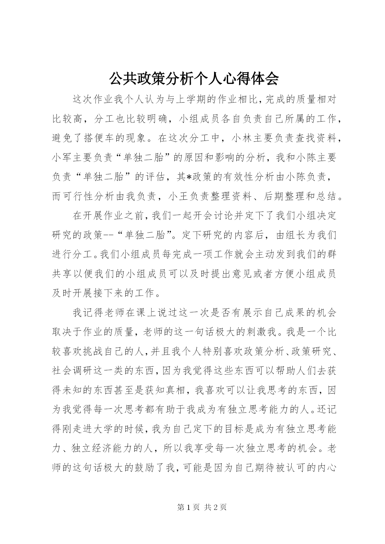 第PAGE\*Arabic\*MERGEFORMAT2页共NUMPAGES\*MERGEFORMAT2页公共政策分析个人心得体会这次作业我个人认为与上学期的作业相比,完成的质量相对比较高,分工也比较明确,小组成员各自负责自己所属的工作,避免了搭便车的现象。在这次分工中,小林主要负责查找资料,小军主要负责“单独二胎”的原因和影响的分析,我和小陈主要负责“单独二胎”的评估,其*政策的有效性分析由小陈负责,而可行性分析由我负责,小王负责整理资料、后期整理和总结。在开展作业之前,我们一起开会讨论并定下