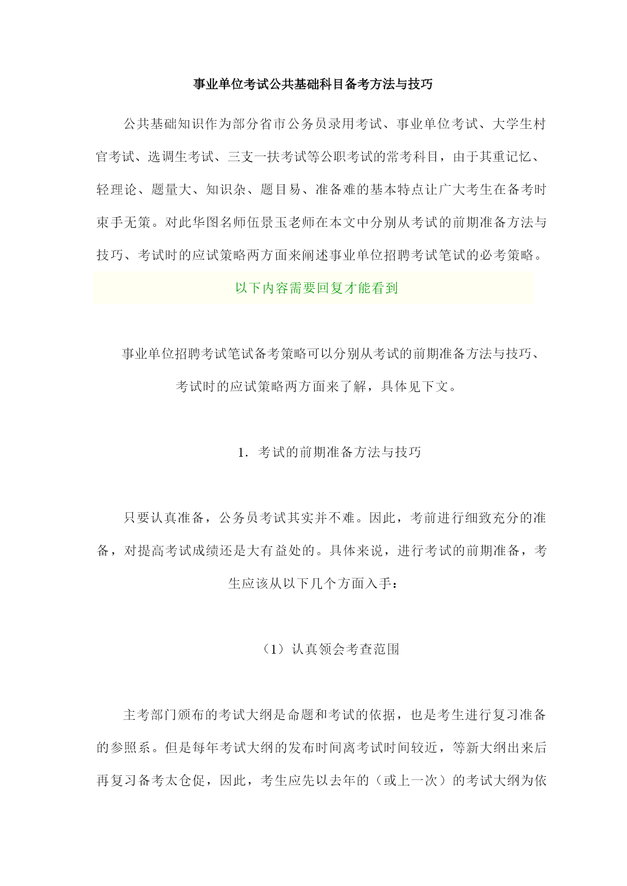 事业单位考试公共基础科目备考方法与技巧公共基础知识作为部分省市公务员录用考试、事业单位考试、大学生村官考试、选调生考试、三支一扶考试等公职考试的常考科目,由于其重记忆、轻理论、题量大、知识杂、题目易、准备难的基本特点让广大考生在备考时束手无策。对此华图名师伍景玉老师在本文中分别从考试的前期准备方法与技巧、考试时的应试策略两方面来阐述事业单位招聘考试笔试的必考策略。以下内容需要回复才能看到事业单位招聘考试笔试备考策略可以分别从考试的前期准备方法与技巧、考试时的应试策略两方面来了解,具体见下文。1.考试的前期