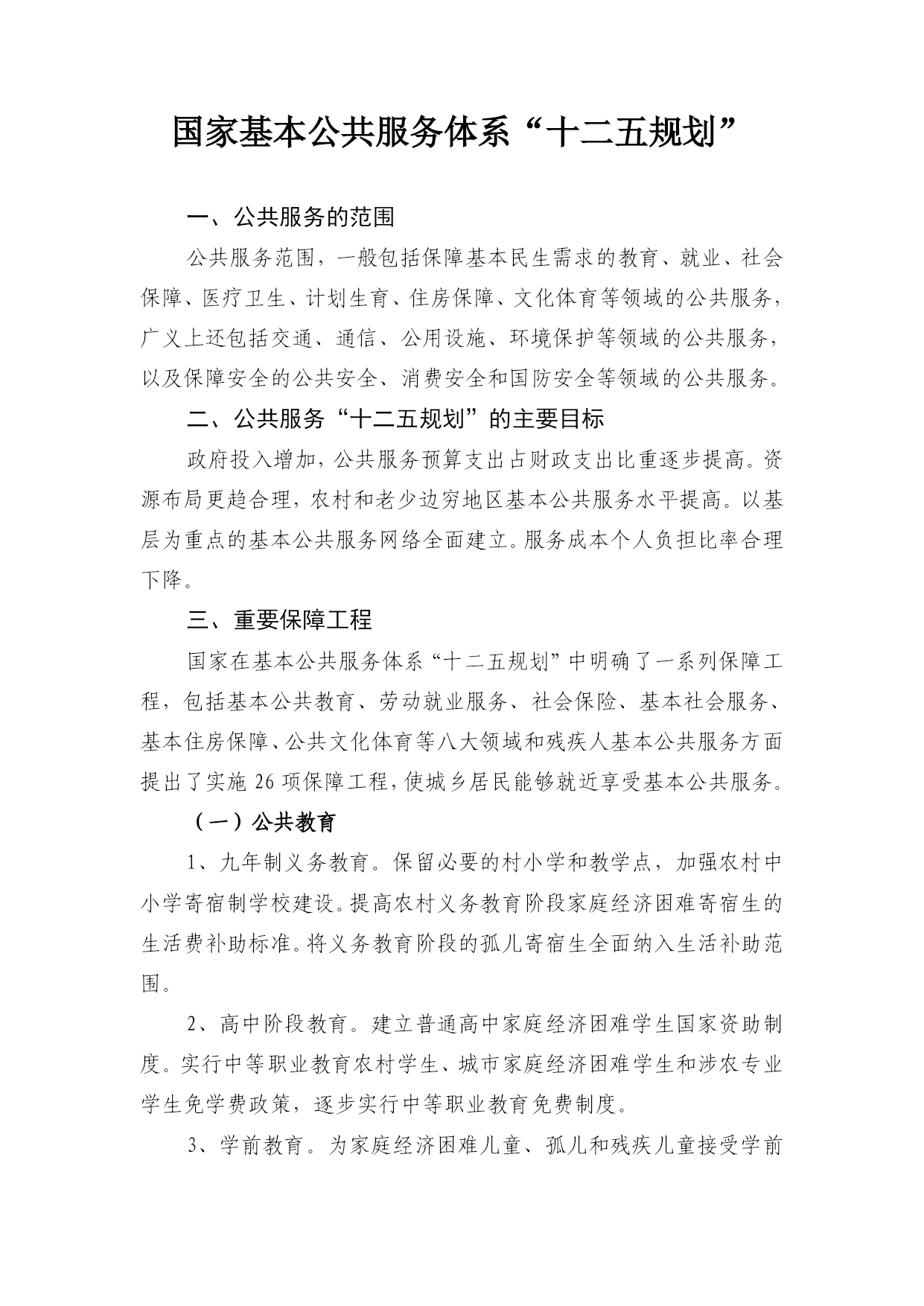 国家基本公共服务体系“十二五规划”一、公共服务的范围公共服务范围,一般包括保障基本民生需求的教育、就业、社会保障、医疗卫生、计划生育、住房保障、文化体育等领域的公共服务,广义上还包括交通、通信、公用设施、环境保护等领域的公共服务,以及保障安全的公共安全、消费安全和国防安全等领域的公共服务。二、公共服务“十二五规划”的主要目标政府投入增加,公共服务预算支出占财政支出比重逐步提高。资源布局更趋合理,农村和老少边穷地区基本公共服务水平提高。以基层为重点的基本公共服务网络全面建立。服务成本个人负担比率合理下降。三