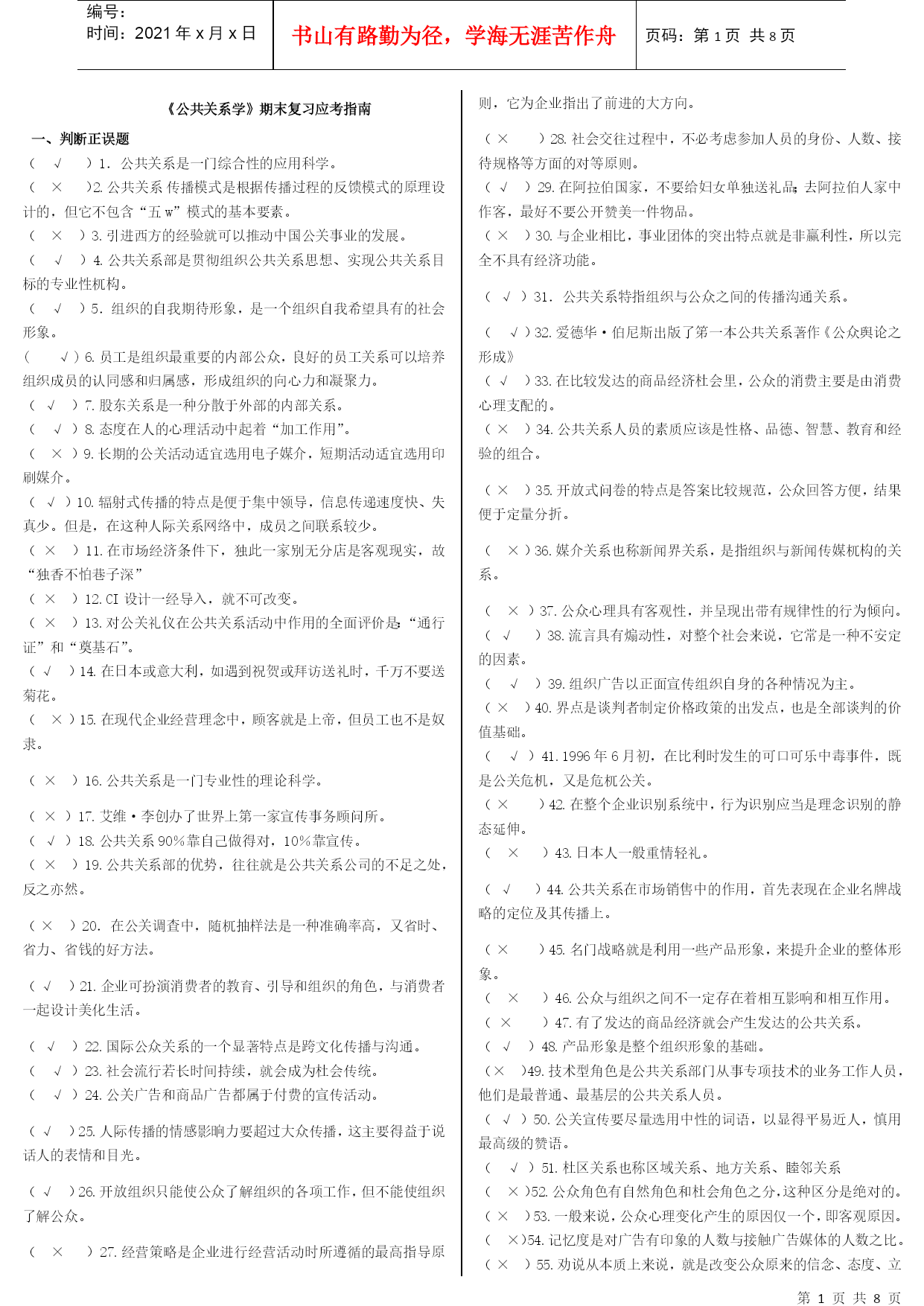 编号:时间:2021年x月x日书山有路勤为径,学海无涯苦作舟页码:第PAGE8页共NUMPAGES8页第PAGE\*MERGEFORMAT8页共NUMPAGES\*MERGEFORMAT8页《公共关系学》期末复习应考指南一、判断正误题(√)1.公共关系是一门综合性的应用科学。(×)2.公共关系传播模式是根据传播过程的反馈模式的原理设计的,但它不包含“五w”模式的基本要素。(×)3.引进西方的经验就可以推动中国公关事业的发展。(√)4.公共关系部是贯彻组织公共关系思想、实现公共关系目