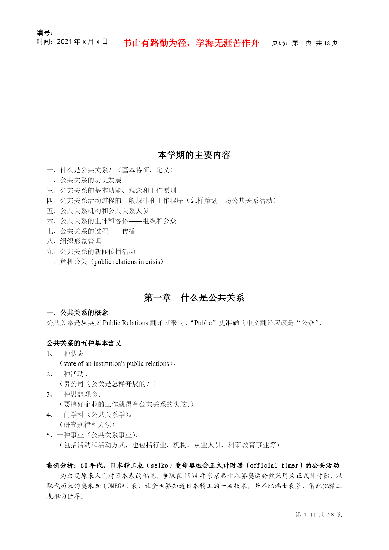 编号:时间:2021年x月x日书山有路勤为径,学海无涯苦作舟页码:第PAGE18页共NUMPAGES18页第PAGE\*MERGEFORMAT18页共NUMPAGES\*MERGEFORMAT18页HYPERLINK"xxxx/"本学期的主要内容一、什么是公共关系?(基本特征、定义)二、公共关系的历史发展三、公共关系的基本功能、观念和工作原则四、公共关系活动过程的一般规律和工作程序(怎样策划一场公共关系活动)五、公共关系机构和公共关系人员六、公共关系的主体和客体——组织和公众