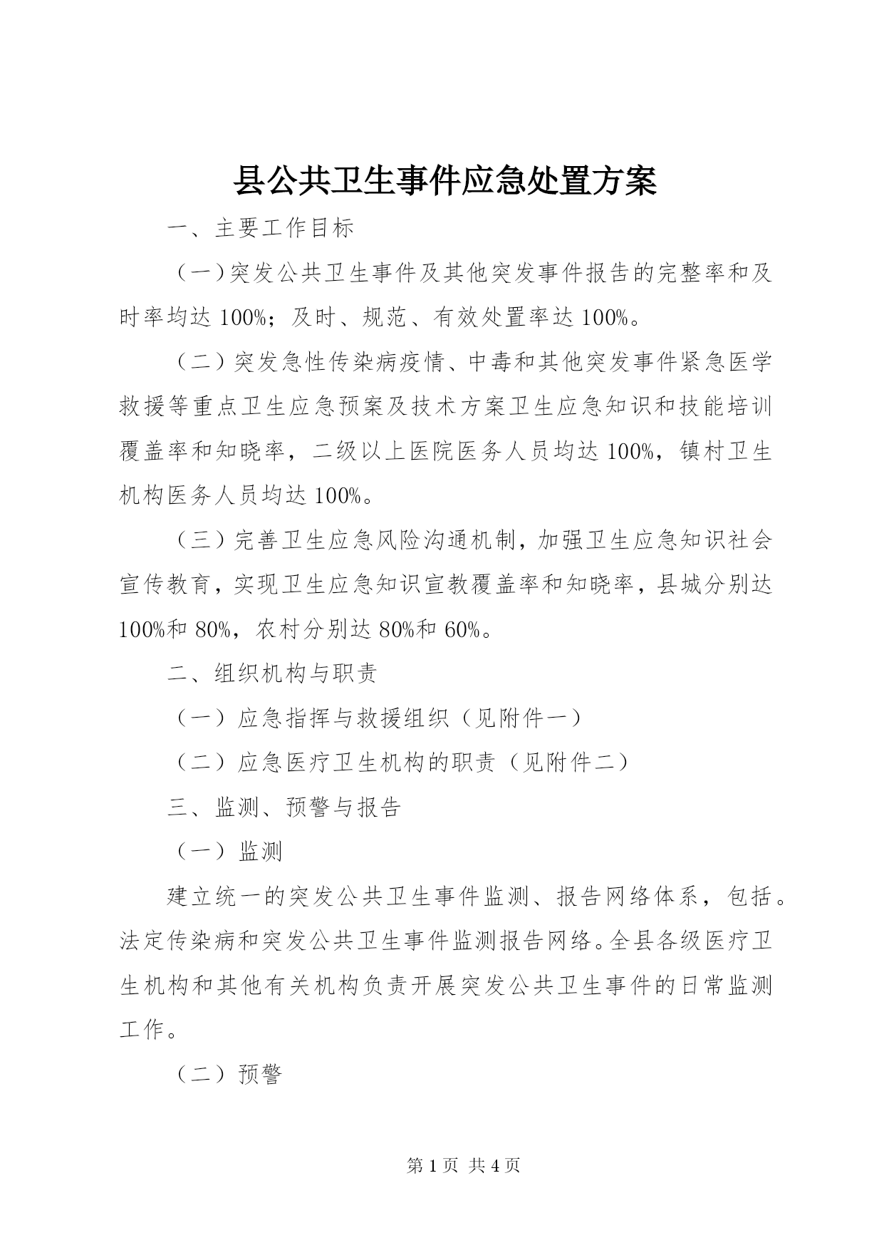 第PAGE\*Arabic\*MERGEFORMAT4页共NUMPAGES\*MERGEFORMAT4页县公共卫生事件应急处置方案一、主要工作目标(一)突发公共卫生事件及其他突发事件报吿的完整率和及时率均达100%;及时、规范、有效处置率达100%。(二)突发急性传染病疫情、中毒和其他突发事件紧急医学救援等重点卫生应急预案及技术方案卫生应急知识和技能培训覆盖率和知晓率,二级以上医院医务人员均达100%,镇村卫生机构医务人员均达100%。(三)完善卫生应急风险沟通机制,加强卫生应急知识社会宣传教