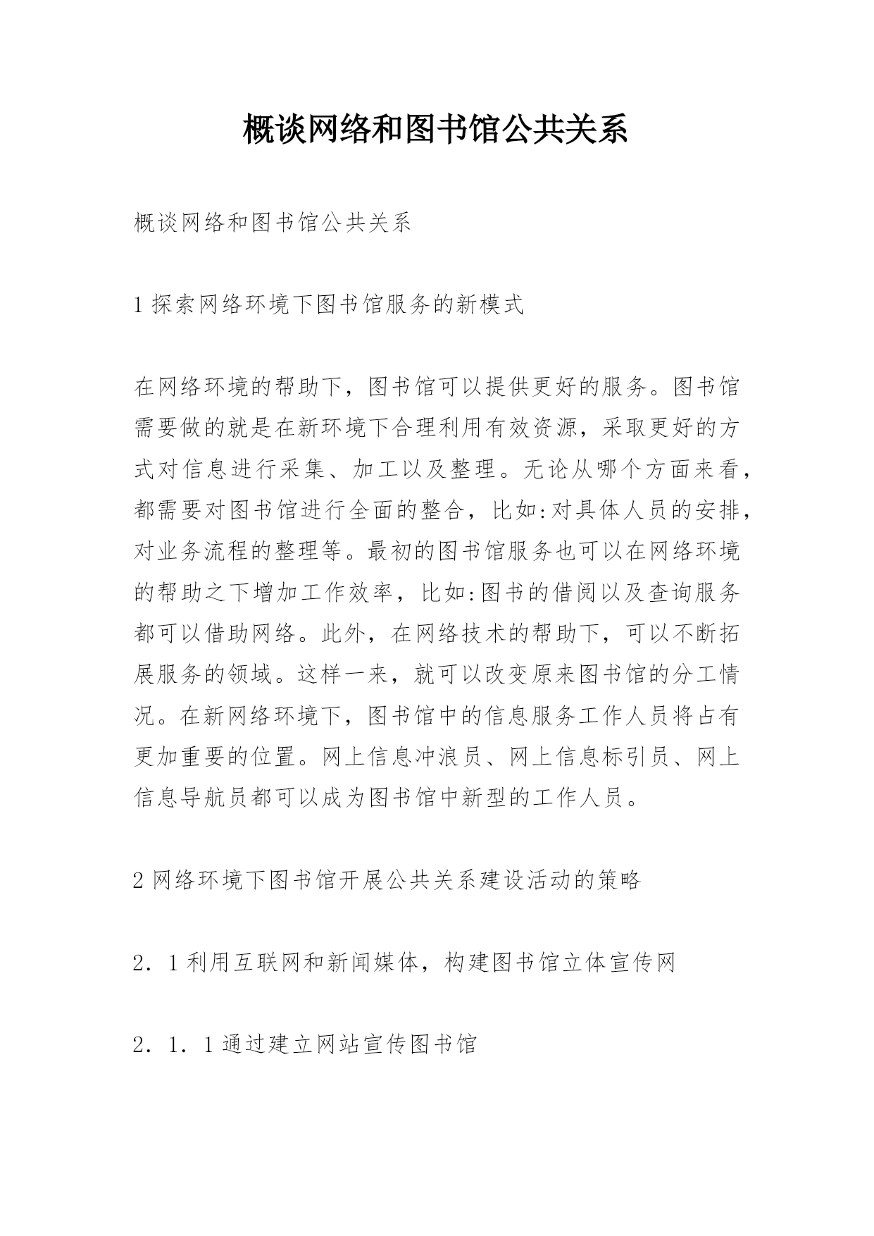 概谈网络和图书馆公共关系概谈网络和图书馆公共关系1探索网络环境下图书馆服务的新模式在网络环境的帮助下,图书馆可以提供更好的服务。图书馆需要做的就是在新环境下合理利用有效资源,采取更好的方式对信息进行采集、加工以及整理。无论从哪个方面来看,都需要对图书馆进行全面的整合,比如:对具体人员的安排,对业务流程的整理等。最初的图书馆服务也可以在网络环境的帮助之下增加工作效率,比如:图书的借阅以及查询服务都可以借助网络。此外,在网络技术的帮助下,可以不断拓展服务的领域。这样一来,就可以改变原来图书馆的分工情况。在新网