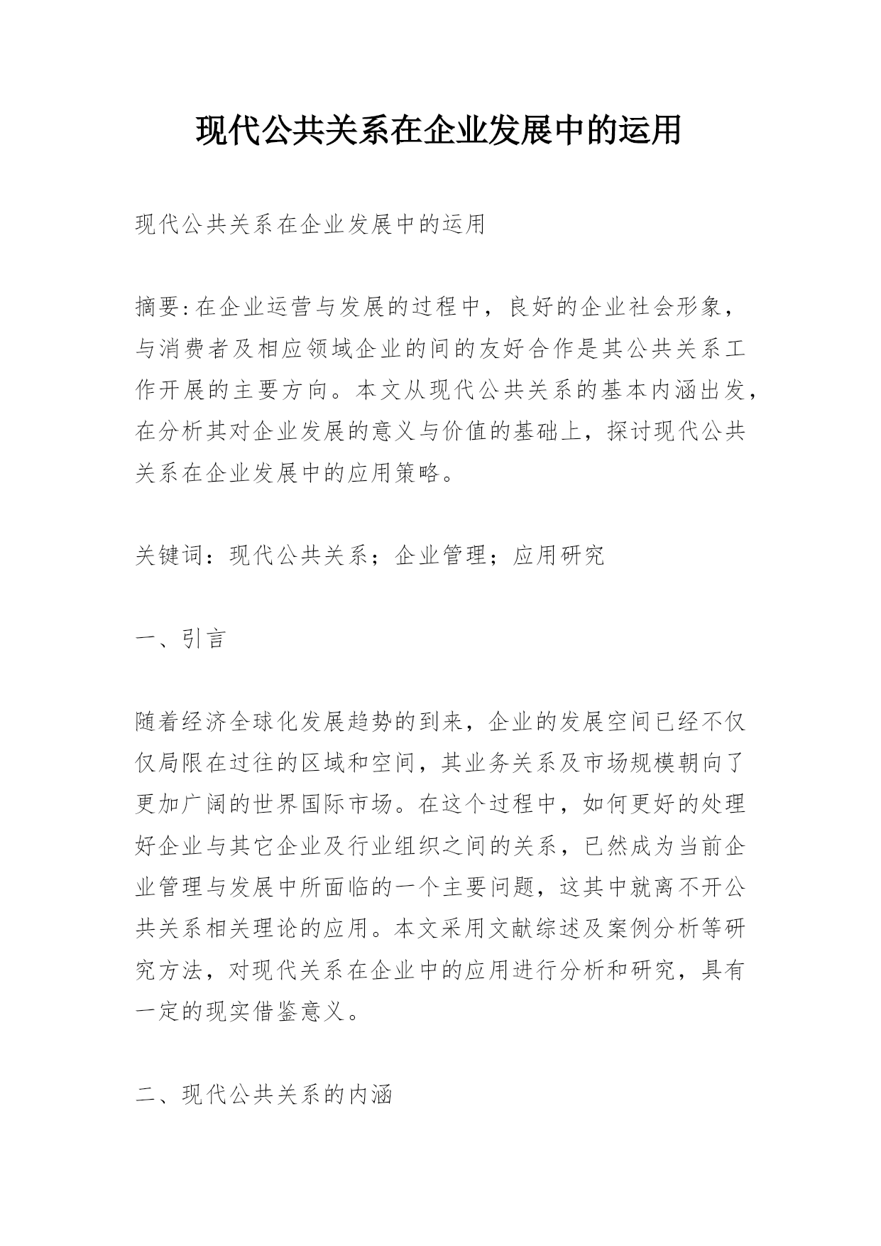 现代公共关系在企业发展中的运用现代公共关系在企业发展中的运用摘要:在企业运营与发展的过程中,良好的企业社会形象,与消费者及相应领域企业的间的友好合作是其公共关系工作开展的主要方向。本文从现代公共关系的基本内涵出发,在分析其对企业发展的意义与价值的基础上,探讨现代公共关系在企业发展中的应用策略。关键词:现代公共关系;企业管理;应用研究一、引言随着经济全球化发展趋势的到来,企业的发展空间已经不仅仅局限在过往的区域和空间,其业务关系及市场规模朝向了更加广阔的世界国际市场。在这个过程中,如何更好的处理好企业与其它