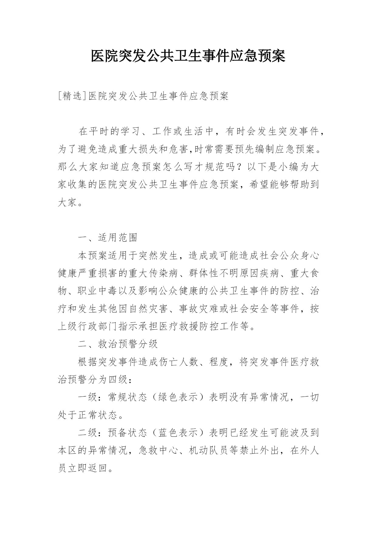 医院突发公共卫生事件应急预案[精选]医院突发公共卫生事件应急预案在平时的学习、工作或生活中,有时会发生突发事件,为了避免造成重大损失和危害,时常需要预先编制应急预案。那么大家知道应急预案怎么写才规范吗?以下是小编为大家收集的医院突发公共卫生事件应急预案,希望能够帮助到大家。一、适用范围本预案适用于突然发生,造成或可能造成社会公众身心健康严重损害的重大传染病、群体性不明原因疾病、重大食物、职业中毒以及影响公众健康的公共卫生事件的防控、治疗和发生其他因自然灾害、事故灾难或社会安全等事件,按上级行政部门指示承担