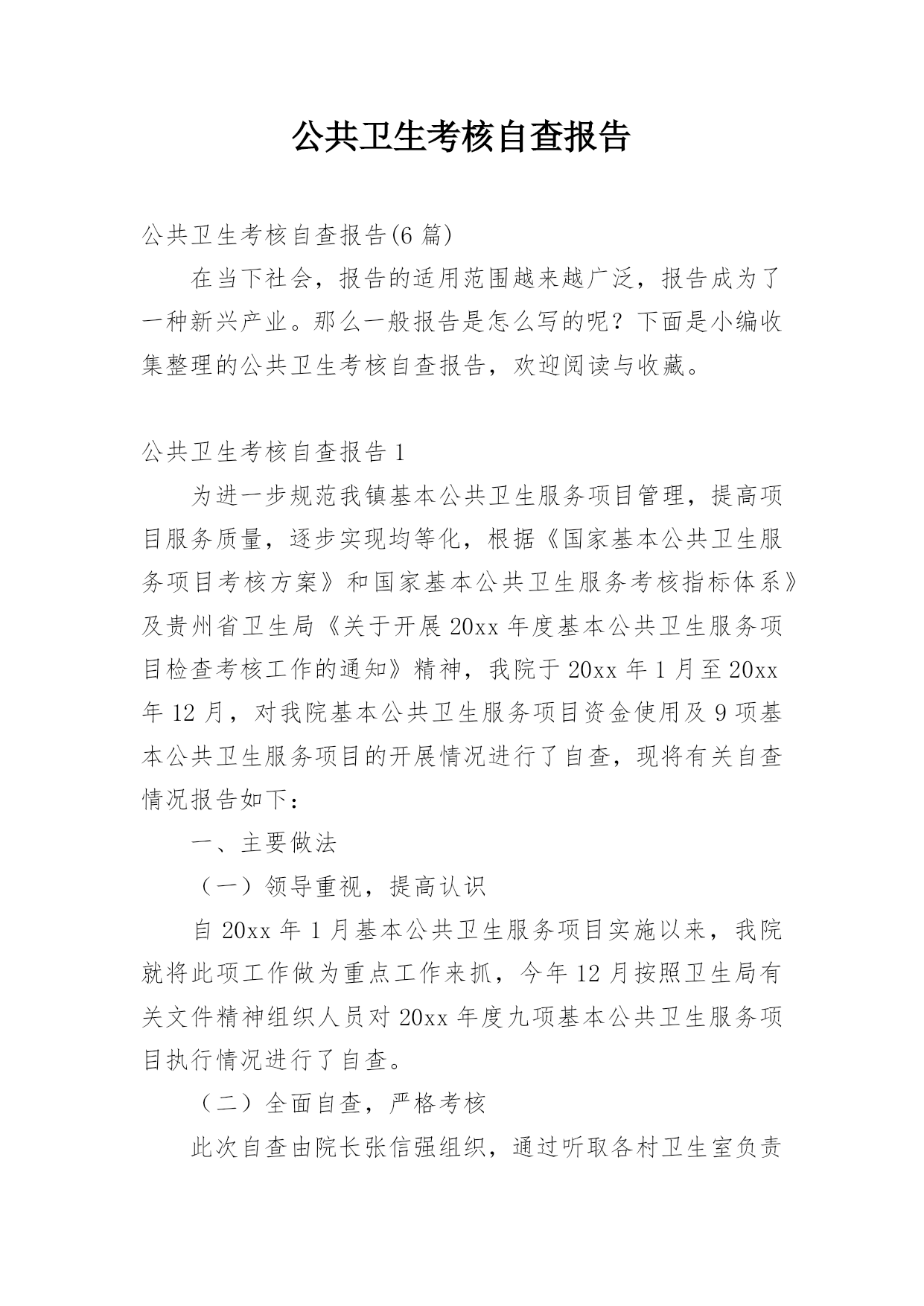 公共卫生考核自查报告公共卫生考核自查报告(6篇)在当下社会,报告的适用范围越来越广泛,报告成为了一种新兴产业。那么一般报告是怎么写的呢?下面是小编收集整理的公共卫生考核自查报告,欢迎阅读与收藏。公共卫生考核自查报告1为进一步规范我镇基本公共卫生服务项目管理,提高项目服务质量,逐步实现均等化,根据《国家基本公共卫生服务项目考核方案》和国家基本公共卫生服务考核指标体系》及贵州省卫生局《关于开展20xx年度基本公共卫生服务项目检查考核工作的通知》精神,我院于20xx年1月至20xx年12月,对我院基本公共卫生服