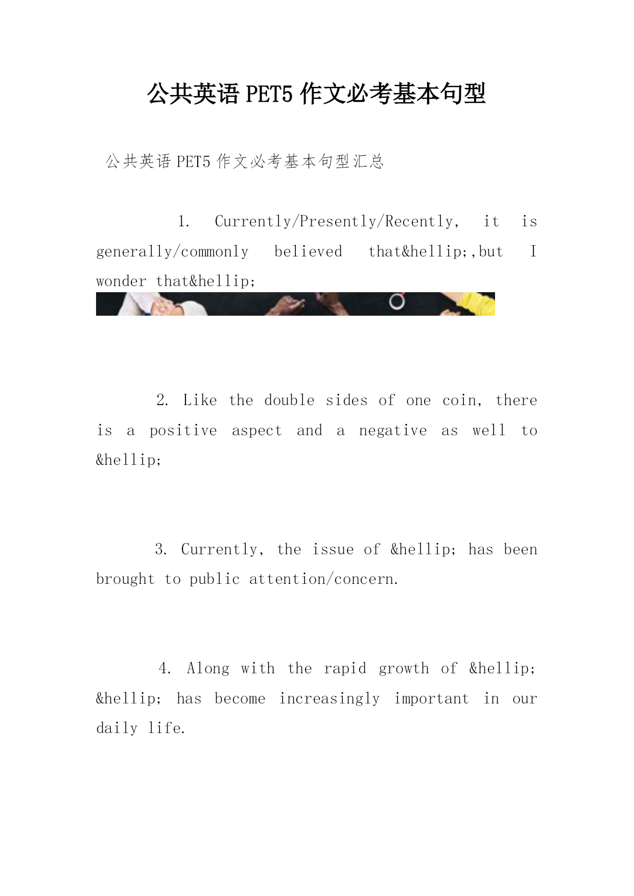 公共英语PET5作文必考基本句型公共英语PET5作文必考基本句型汇总1.Currently/Presently/Recently,itisgenerally/commonlybelievedthat…,butIwonderthat…2.Likethedoublesidesofonecoin,thereisapositiveaspectandanegativeaswellto…3.Currently,theissueof…hasbeenbroughtt