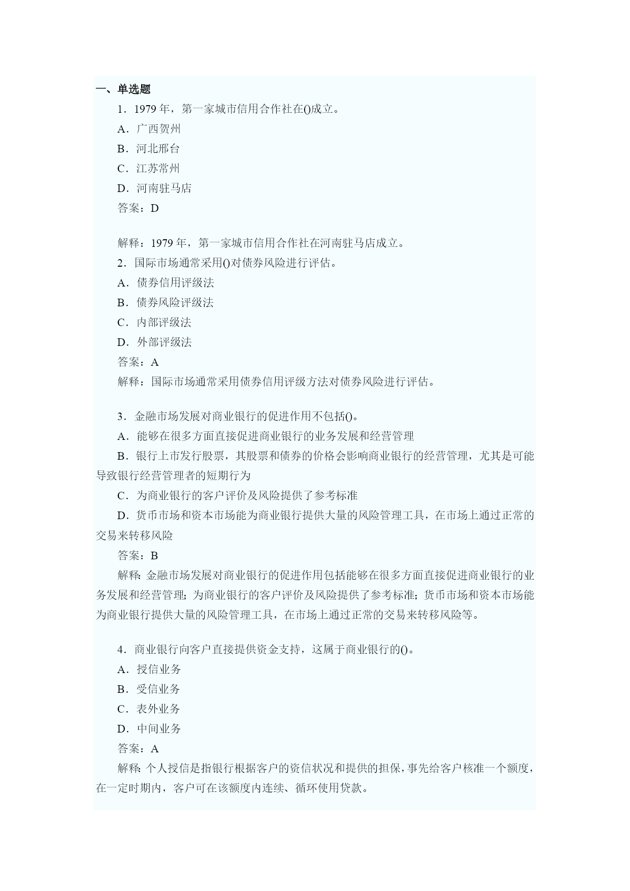 一、单选题1.1979年,第一家城市信用合作社在()成立。A.广西贺州B.河北邢台C.江苏常州D.河南驻马店答案:D解释:1979年,第一家城市信用合作社在河南驻马店成立。2.国际市场通常采用()对债券风险进行评估。A.债券信用评级法B.债券风险评级法C.内部评级法D.外部评级法答案:A解释:国际市场通常采用债券信用评级方法对债券风险进行评估。3.金融市场发展对商业银行的促进作用不包括()。A.能够在很多方面直接促进商业银行的业务发展和经营管理B.银行上市发行股票,其股票和债券的价格会影响商业银行的经营管