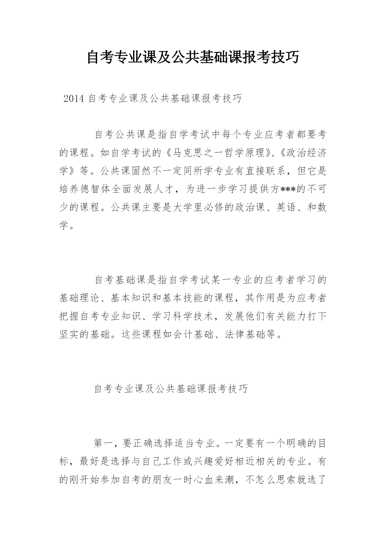 自考专业课及公共基础课报考技巧2014自考专业课及公共基础课报考技巧自考公共课是指自学考试中每个专业应考者都要考的课程。如自学考试的《马克思之一哲学原理》、《政治经济学》等。公共课固然不一定同所学专业有直接联系,但它是培养德智体全面发展人才,为进一步学习提供方***的不可少的课程。公共课主要是大学里必修的政治课、英语、和数学。自考基础课是指自学考试某一专业的应考者学习的基础理论、基本知识和基本技能的课程,其作用是为应考者把握自考专业知识、学习科学技术,发展他们有关能力打下坚实的基础。这些课程如会计基础、法