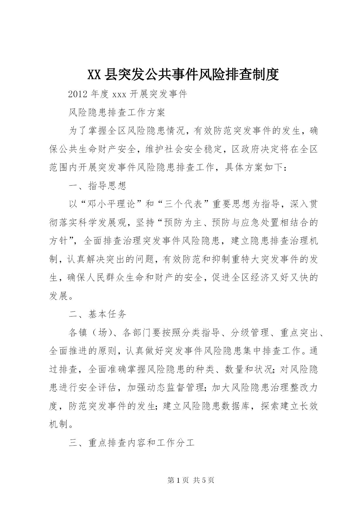 第PAGE\*Arabic\*MERGEFORMAT5页共NUMPAGES\*MERGEFORMAT5页XX县突发公共事件风险排查制度2012年度xxx开展突发事件风险隐患排查工作方案为了掌握全区风险隐患情况,有效防范突发事件的发生,确保公共生命财产安全,维护社会安全稳定,区政府决定将在全区范围内开展突发事件风险隐患排查工作,具体方案如下:一、指导思想以“邓小平理论”和“三个代表”重要思想为指导,深入贯彻落实科学发展观,坚持“预防为主、预防与应急处置相结合的方针”,全面排查治理突发事件风险隐患