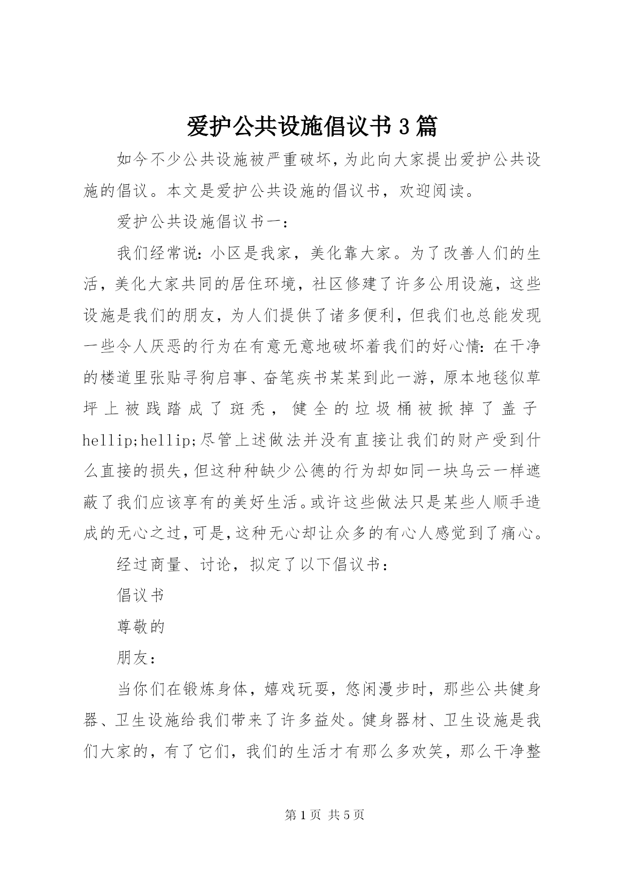 第PAGE\*Arabic\*MERGEFORMAT17页共NUMPAGES\*MERGEFORMAT17页爱护公共设施倡议书4篇爱护校园公共设施倡议书亲爱的同学们:您渴望在一个绿树成荫、鸟语花香的地方生活吗。您渴望在一个整洁温馨的环境中工作学习吗。那么让我们携手同行,爱护公共设施、保护校园环境,为自己营造一个和谐美好的家园。优美的校园环境,会使我们在学习时,心情舒畅;优美的校园环境,会让我们懂得珍惜,学会爱护;优美的校园环境,彰显每个人的素质,体现整个学校的道德风貌;然而,走在校园里,瓜子壳