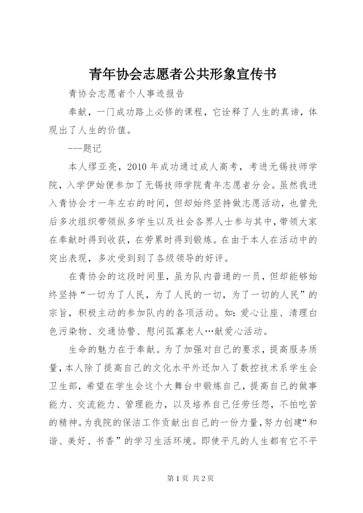 第PAGE\*Arabic\*MERGEFORMAT2页共NUMPAGES\*MERGEFORMAT2页青年协会志愿者公共形象宣传书青协会志愿者个人事迹报告奉献,一门成功路上必修的课程,它诠释了人生的真谛,体现出了人生的价值。---题记本人缪亚亮,2010年成功通过成人高考,考进无锡技师学院,入学伊始便参加了无锡技师学院青年志愿者分会。虽然我进入青协会才一年左右的时间,但却始终坚持做志愿活动,也曾先后多次组织带领纵多学生以及社会各界人士参与其中,带领大家在奉献时得到收获,在劳累时得到锻炼。在由