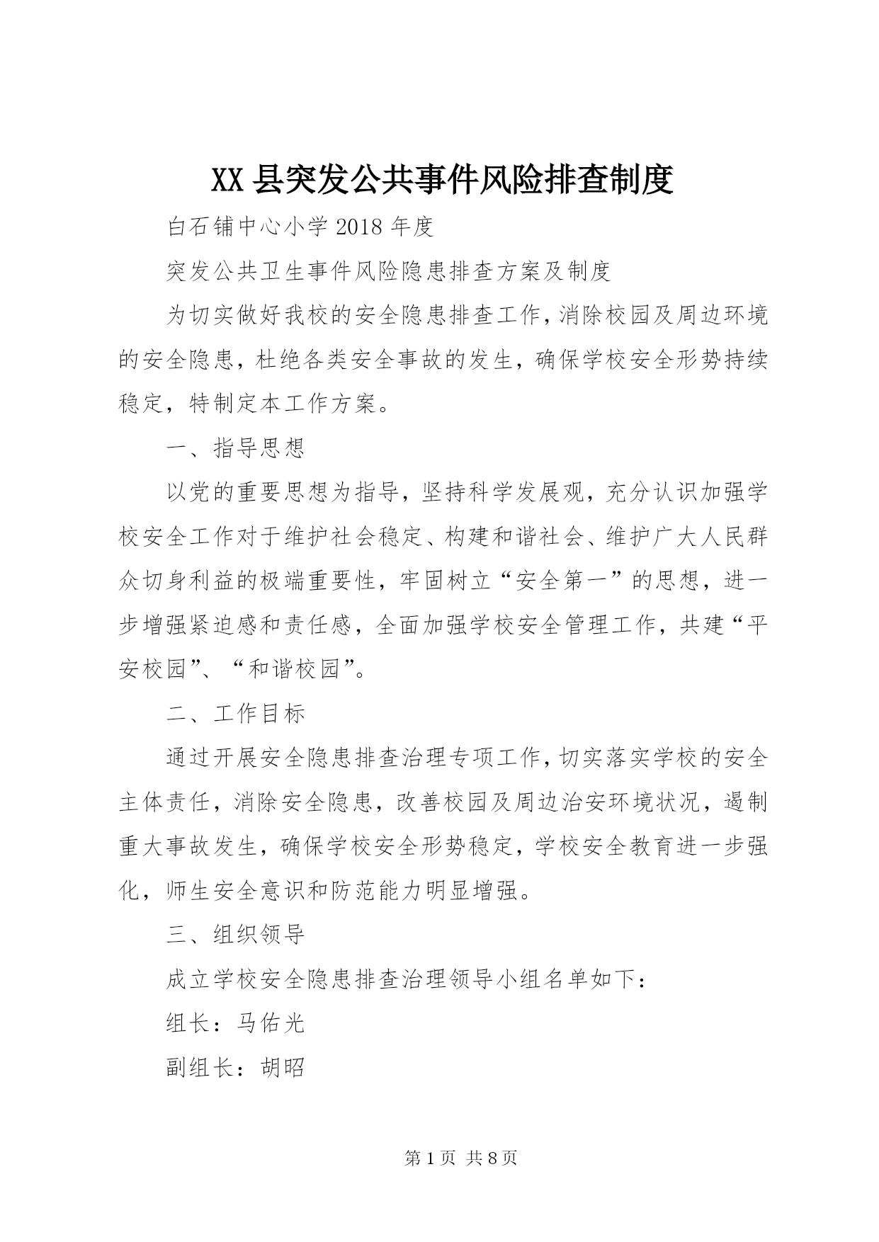第PAGE\*Arabic\*MERGEFORMAT8页共NUMPAGES\*MERGEFORMAT8页XX县突发公共事件风险排查制度白石铺中心小学2018年度突发公共卫生事件风险隐患排查方案及制度为切实做好我校的安全隐患排查工作,消除校园及周边环境的安全隐患,杜绝各类安全事故的发生,确保学校安全形势持续稳定,特制定本工作方案。一、指导思想以党的重要思想为指导,坚持科学发展观,充分认识加强学校安全工作对于维护社会稳定、构建和谐社会、维护广大人民群众切身利益的极端重要性,牢固树立“安全第一”的思