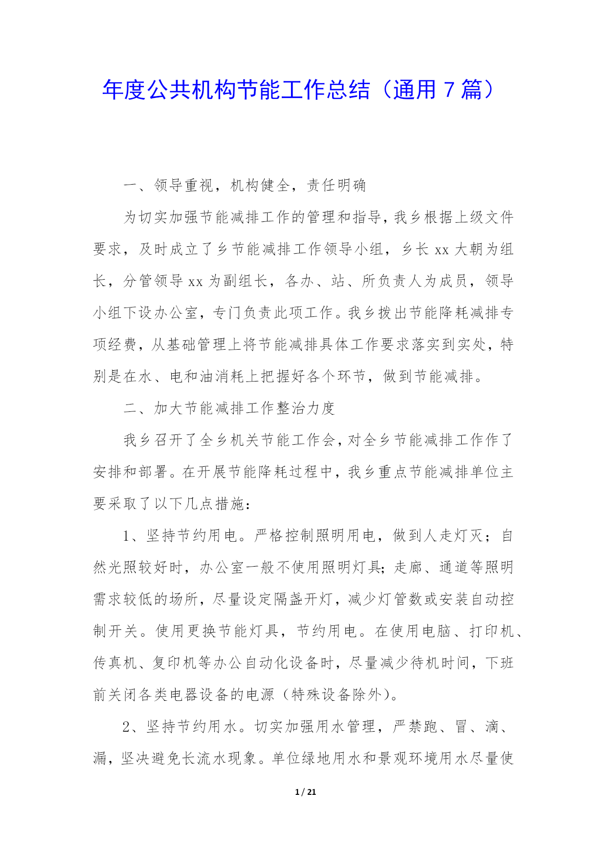 PAGE21/NUMPAGES21年度公共机构节能工作总结(通用7篇)一、领导重视,机构健全,责任明确为切实加强节能减排工作的管理和指导,我乡根据上级文件要求,及时成立了乡节能减排工作领导小组,乡长xx大朝为组长,分管领导xx为副组长,各办、站、所负责人为成员,领导小组下设办公室,专门负责此项工作。我乡拨出节能降耗减排专项经费,从基础管理上将节能减排具体工作要求落实到实处,特别是在水、电和油消耗上把握好各个环节,做到节能减排。二、加大节能减排工作整治力度我乡召开了全乡机关节能工作会,对全乡节能