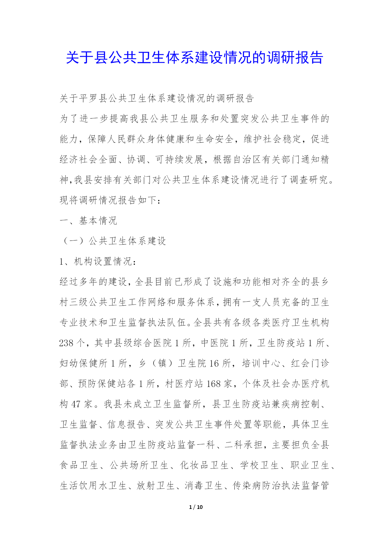 PAGE10/NUMPAGES10关于县公共卫生体系建设情况的调研报告关于平罗县公共卫生体系建设情况的调研报告为了进一步提高我县公共卫生服务和处置突发公共卫生事件的能力,保障人民群众身体健康和生命安全,维护社会稳定,促进经济社会全面、协调、可持续发展,根据自治区有关部门通知精神,我县安排有关部门对公共卫生体系建设情况进行了调查研究。现将调研情况报告如下:一、基本情况(一)公共卫生体系建设1、机构设置情况:经过多年的建设,全县目前已形成了设施和功能相对齐全的县乡村三级公共卫生工作网络和服务体系,