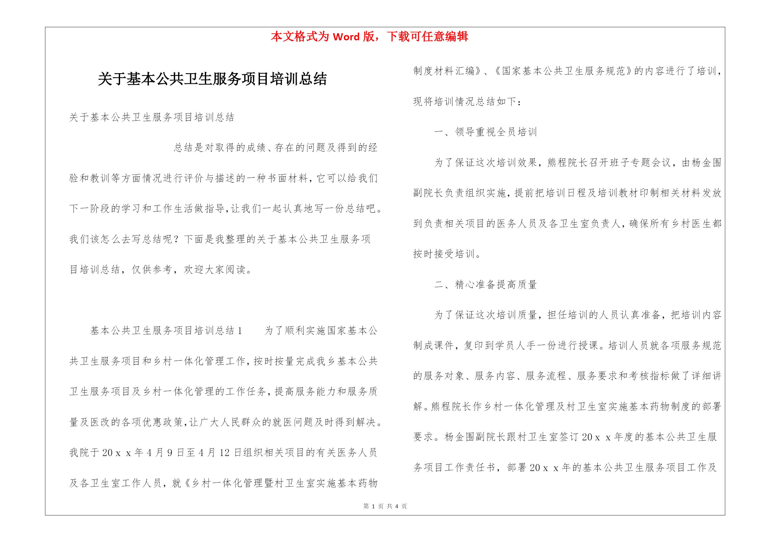 本文格式为Word版,下载可任意编辑第PAGE\*MERGEFORMAT4页共NUMPAGES\*MERGEFORMAT4页关于基本公共卫生服务项目培训总结关于基本公共卫生服务项目培训总结总结是对取得的成绩、存在的问题及得到的经验和教训等方面情况进行评价与描述的一种书面材料,它可以给我们下一阶段的学习和工作生活做指导,让我们一起认真地写一份总结吧。我们该怎么去写总结呢?下面是我整理的关于基本公共卫生服务项目培训总结,仅供参考,欢迎大家阅读。基本公共卫生服务项目培训总结1为了顺利实施国家基本公共