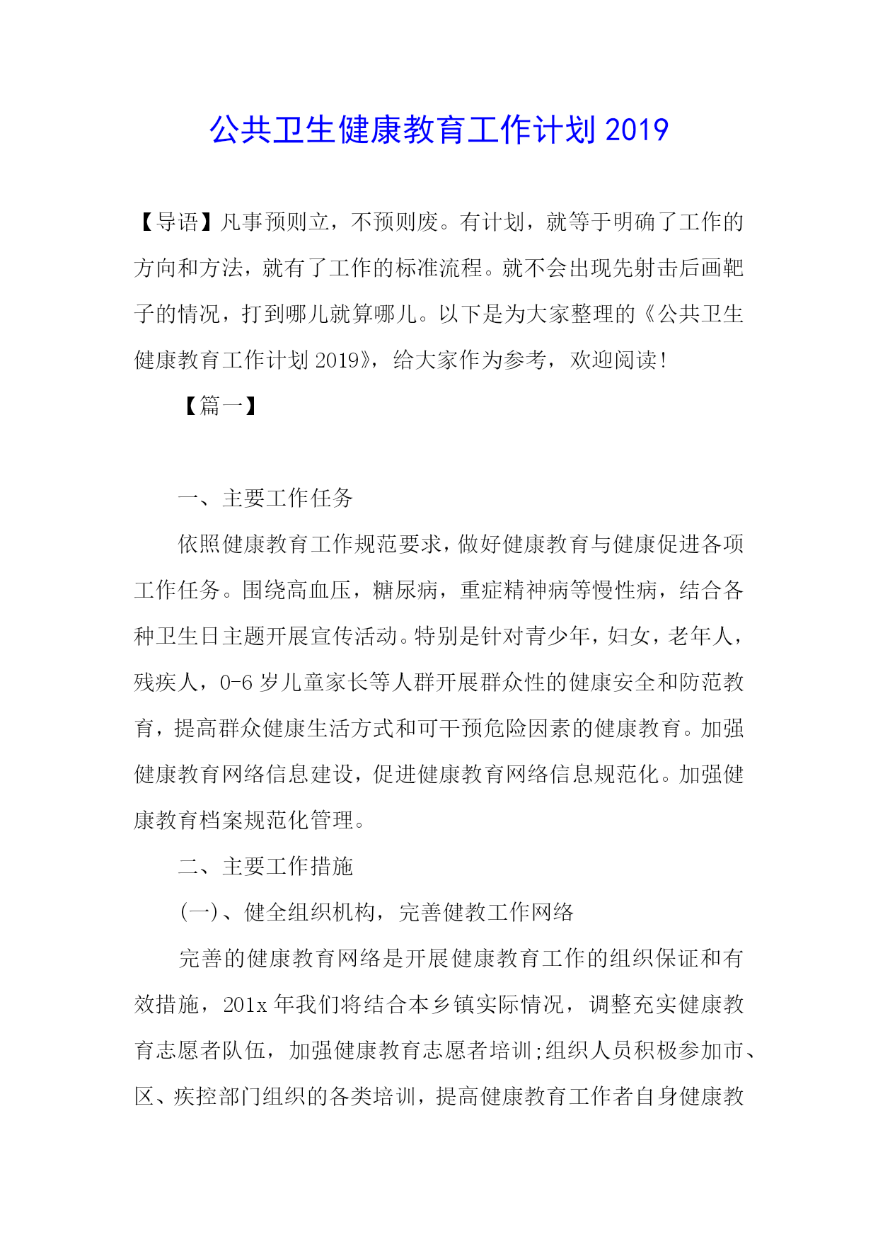 公共卫生健康教育工作计划2019.docx