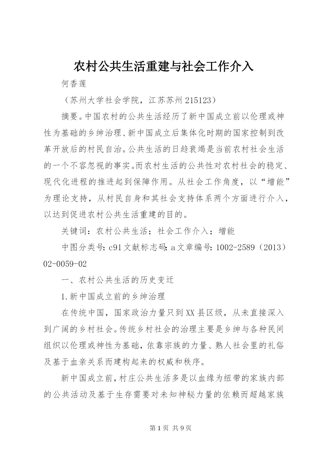 第PAGE\*Arabic\*MERGEFORMAT9页共NUMPAGES\*MERGEFORMAT9页农村公共生活重建与社会工作介入何香莲(苏州大学社会学院,江苏苏州215123)摘要。中国农村的公共生活经历了新中国成立前以伦理或神性为基础的乡绅治理、新中国成立后集体化时期的国家控制到改革开放后的村民自治。公共生活的日趋衰竭是当前农村社会生活的一个不容忽视的事实。而农村生活的公共性对农村社会的稳定、现代化进程的推进起到保障作用。从社会工作角度,以“增能”为理论支持,从村民自身和其社会支持体系