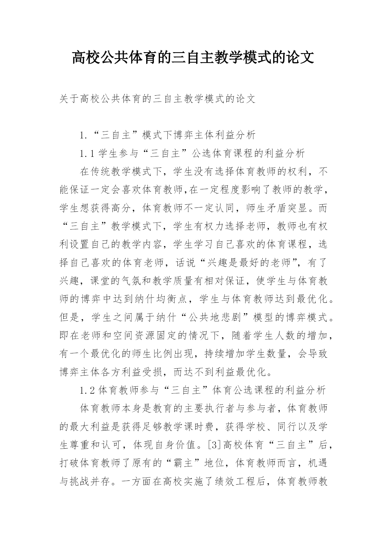 高校公共体育的三自主教学模式的论文关于高校公共体育的三自主教学模式的论文1.“三自主”模式下博弈主体利益分析1.1学生参与“三自主”公选体育课程的利益分析在传统教学模式下,学生没有选择体育教师的权利,不能保证一定会喜欢体育教师,在一定程度影响了教师的教学,学生想获得高分,体育教师不一定认同,师生矛盾突显。而“三自主”教学模式下,学生有权力选择老师,教师也有权利设置自己的教学内容,学生学习自己喜欢的体育课程,选择自己喜欢的体育老师,话说“兴趣是最好的老师”,有了兴趣,课堂的气氛和教学质量有相对保证,使学生与