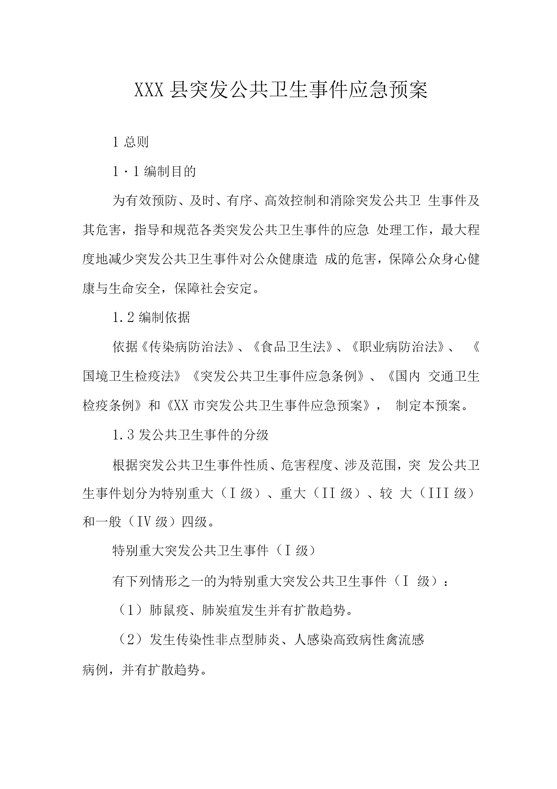 XXX县突发公共卫生事件应急预案1总则1・1编制目的为有效预防、及时、有序、高效控制和消除突发公共卫生事件及其危害,指导和规范各类突发公共卫生事件的应急处理工作,最大程度地减少突发公共卫生事件对公众健康造成的危害,保障公众身心健康与生命安全,保障社会安定。1.2编制依据依据《传染病防治法》、《食品卫生法》、《职业病防治法》、《国境卫生检疫法》《突发公共卫生事件应急条例》、《国内交通卫生检疫条例》和《XX市突发公共卫生事件应急预案》,制定本预案。1.3发公共卫生事件的分级根据突发公共卫生事件性质、危害程度、
