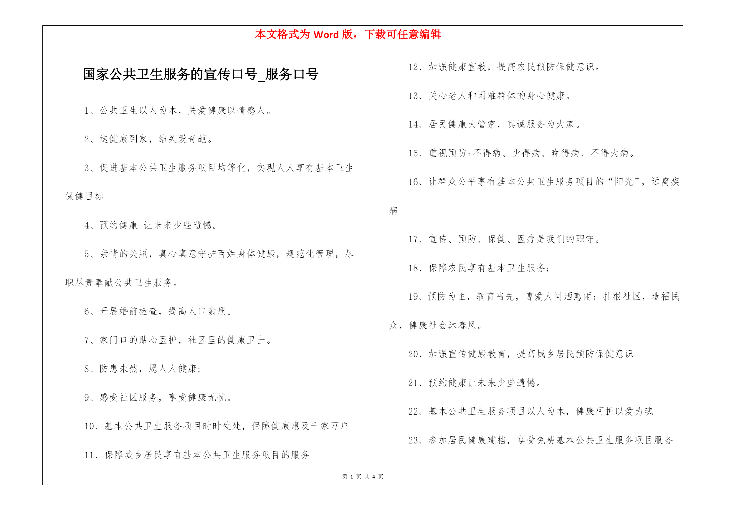 本文格式为Word版,下载可任意编辑第PAGE\*MERGEFORMAT4页共NUMPAGES\*MERGEFORMAT4页国家公共卫生服务的宣传口号_服务口号1、公共卫生以人为本,关爱健康以情感人。2、送健康到家,结关爱奇葩。3、促进基本公共卫生服务项目均等化,实现人人享有基本卫生保健目标4、预约健康让未来少些遗憾。5、亲情的关照,真心真意守护百姓身体健康,规范化管理,尽职尽责奉献公共卫生服务。6、开展婚前检查,提高人口素质。7、家门口的贴心医护,社区里的健康卫士。8、防患未然,愿人人健康;