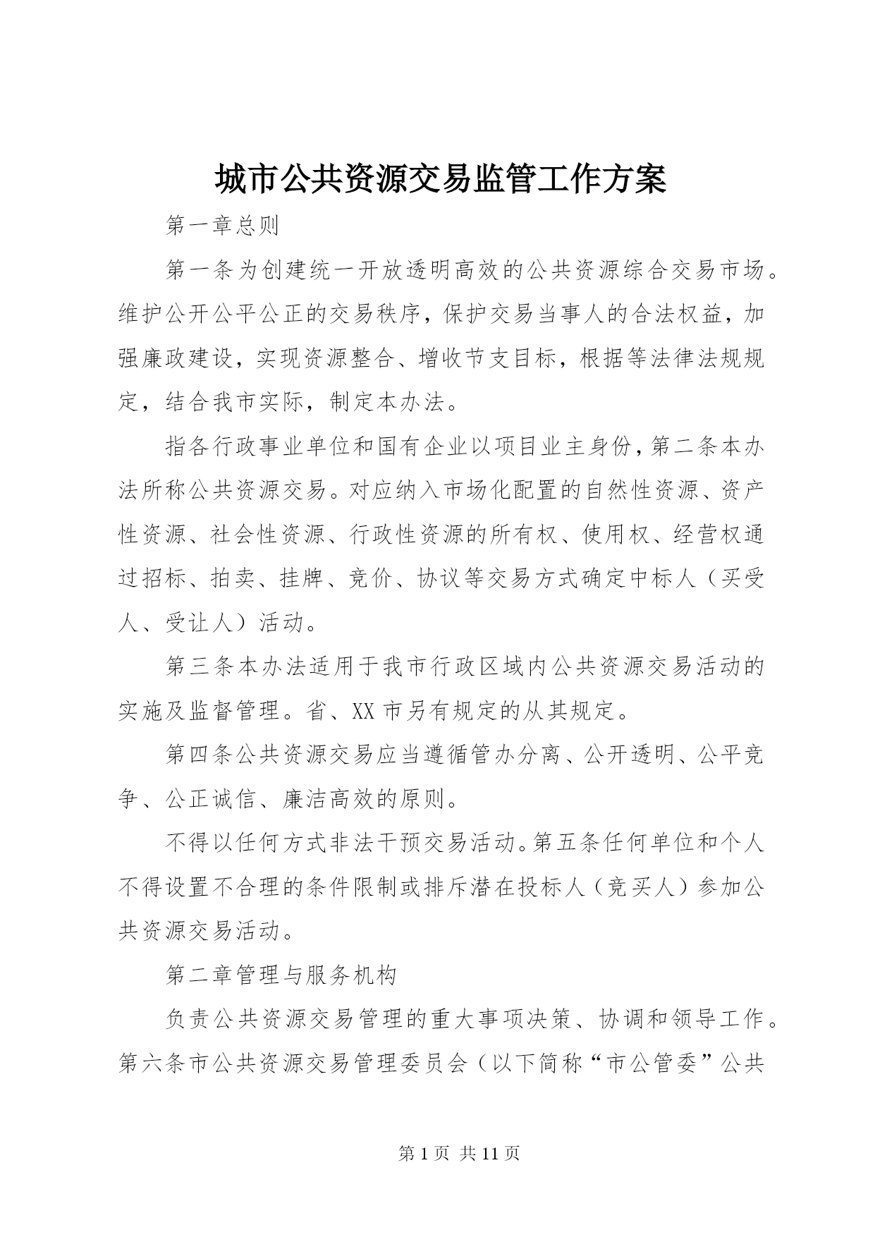 第PAGE\*Arabic\*MERGEFORMAT11页共NUMPAGES\*MERGEFORMAT11页城市公共资源交易监管工作方案第一章总则第一条为创建统一开放透明高效的公共资源综合交易市场。维护公开公平公正的交易秩序,保护交易当事人的合法权益,加强廉政建设,实现资源整合、增收节支目标,根据等法律法规规定,结合我市实际,制定本办法。指各行政事业单位和国有企业以项目业主身份,第二条本办法所称公共资源交易。对应纳入市场化配置的自然性资源、资产性资源、社会性资源、行政性资源的所有权、使用权、经