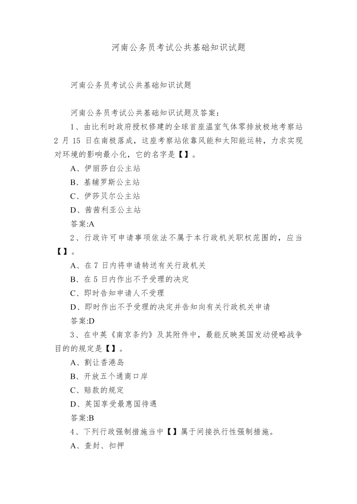 河南公务员考试公共基础知识试题河南公务员考试公共基础知识试题河南公务员考试公共基础知识试题及答案:1、由比利时政府授权修建的全球首座温室气体零排放极地考察站2月15日在南极落成,这座考察站依靠风能和太阳能运转,力求实现对环境的影响最小化,它的名字是【】。A、伊丽莎白公主站B、基辅罗斯公主站C、伊莎贝尔公主站D、茜茜利亚公主站答案:A2、行政许可申请事项依法不属于本行政机关职权范围的,应当【】。A、在7日内将申请转送有关行政机关B、在5日内作出不予受理的决定C、即时告知申请人不受理D、即时作出不予受理的决定