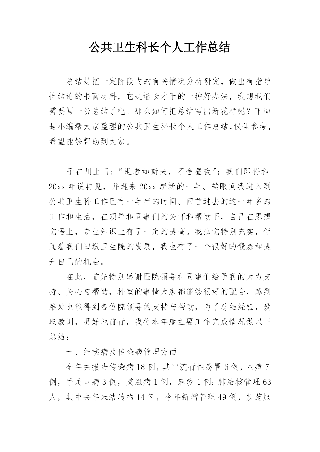 公共卫生科长个人工作总结总结是把一定阶段内的有关情况分析研究,做出有指导性结论的书面材料,它是增长才干的一种好办法,我想我们需要写一份总结了吧。那么如何把总结写出新花样呢?下面是小编帮大家整理的公共卫生科长个人工作总结,仅供参考,希望能够帮助到大家。子在川上日:“逝者如斯夫,不舍昼夜”;我们即将和20xx年说再见,并迎来20xx崭新的一年。转眼间我进入到公共卫生科工作已有一年半的时间。回首过去的这一年多的工作和生活,在领导和同事们的关怀和帮助下,自己在思想觉悟上,专业知识上有了一定的提高。我感觉特别充实,