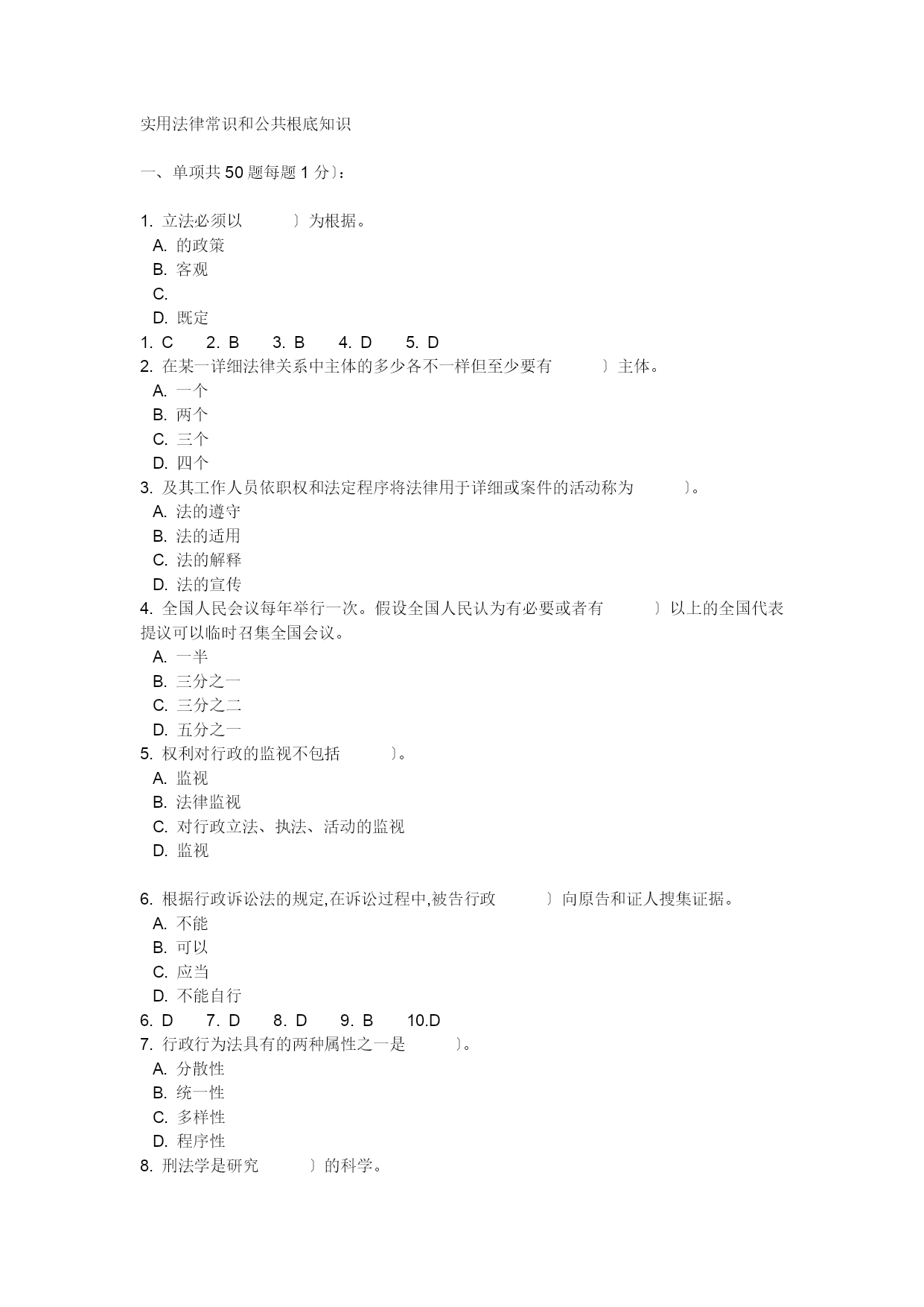 实用法律常识和公共根底知识一、单项共50题每题1分〕:u-gsC?N+8=R4Lo9l!1.立法必须以〕为根据。geN/DJNv~A.的政策b"B!ZzB.客观h0Z;"}3C.,J8)D.既定/w,z=H1.C2.B3.B4.D5.D<!g0~odx:2.在某一详细法律关系中主体的多少各不一样但至少要有〕主体。($,*87A.一个-]xb[Og{4B.两个}#MzISvKC.三个UXpUS[kD.四个N?(),-X@3.及其工作人员依职权和法定程序将法律用于详细或案件的活动称为〕。AL0qt<