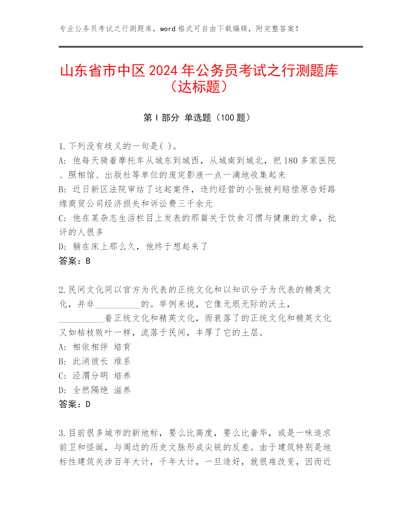 山东省市中区2024年公务员考试之行测题库(达标题).docx