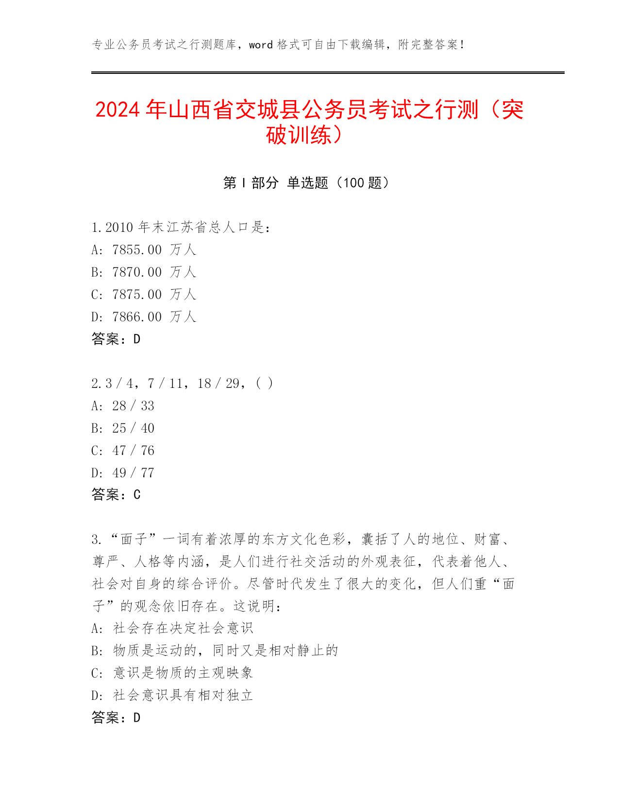 专业公务员考试之行测题库,word格式可自由下载编辑,附完整答案!2024年山西省交城县公务员考试之行测(突破训练)第I部分单选题(100题)1.2010年末江苏省总人口是:A:7855.00万人B:7870.00万人C:7875.00万人D:7866.00万人答案:D2.3/4,7/11,18/29,()A:28/33B:25/40C:47/76D:49/77答案:C3.“面子”一词有着浓厚的东方文化色彩,囊括了人的地位、财富、尊严、人格等内涵,是人们进行社交活动的外观表征,代表着他人、社会对自身的综合