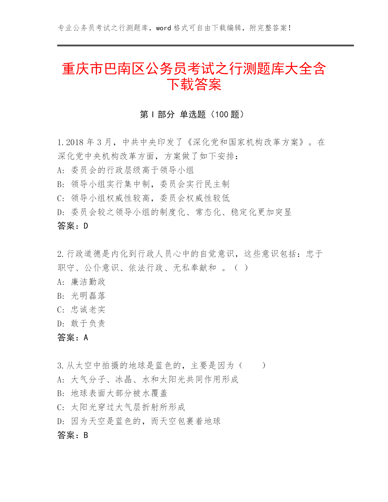 专业公务员考试之行测题库,word格式可自由下载编辑,附完整答案!重庆市巴南区公务员考试之行测题库大全含下载答案第I部分单选题(100题)1.2018年3月,中共中央印发了《深化党和国家机构改革方案》。在深化党中央机构改革方面,方案做了如下安排:A:委员会的行政层级高于领导小组B:领导小组实行集中制,委员会实行民主制C:领导小组权威性较高,委员会权威性较低D:委员会较之领导小组的制度化、常态化、稳定化更加突显答案:D2.行政道德是内化到行政人员心中的自觉意识,这些意识包括:忠于职守、公仆意识、依法行政、无