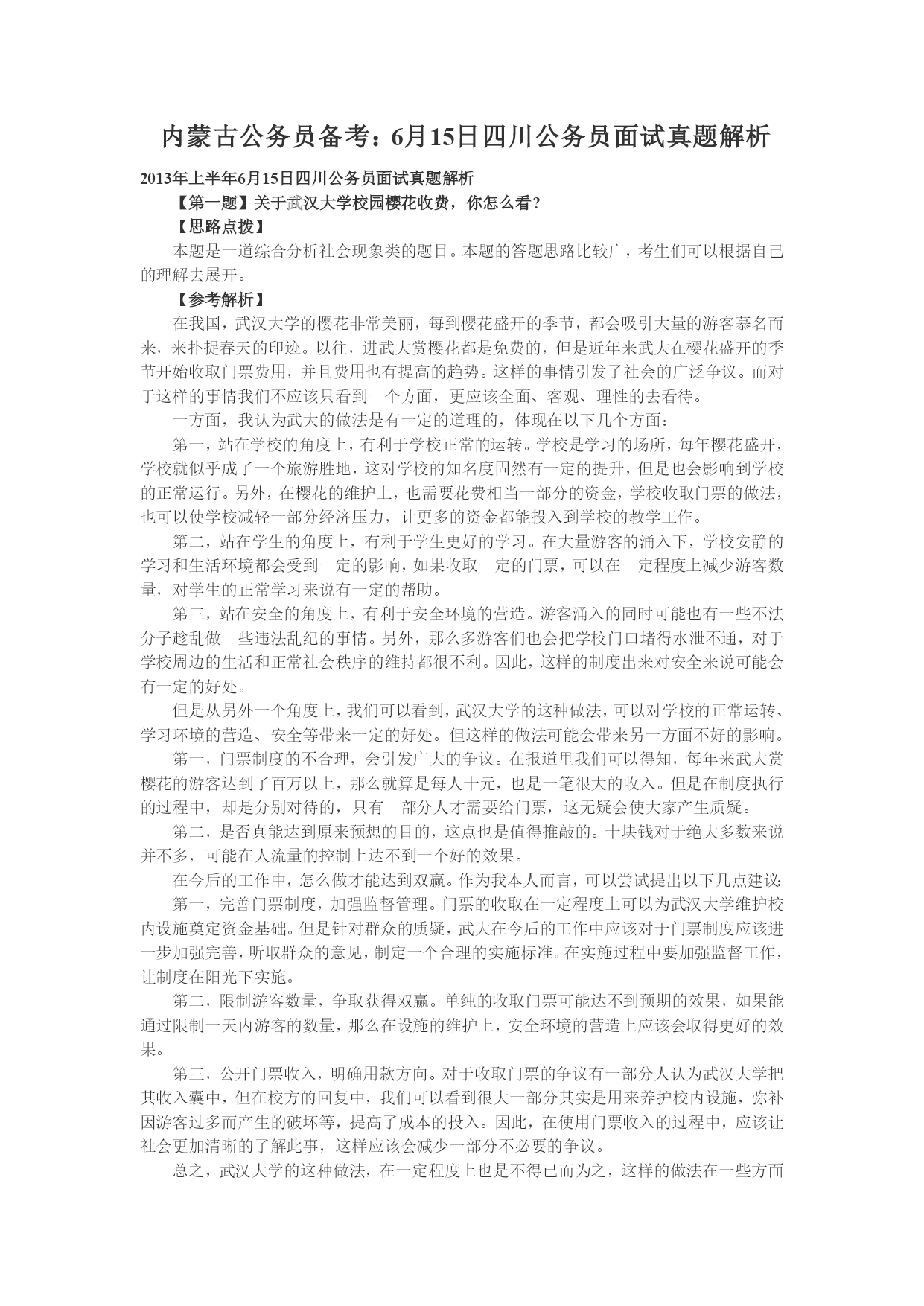 内蒙古公务员备考:6月15日四川公务员面试真题解析2013年上半年6月15日HYPERLINK"http://sc.huatu.com/"四川HYPERLINK"http://www.huatu.com/z/gwyzt/"公务员面试真题解析【第一题】关于HYPERLINK"http://wuhan.huatu.com/"武汉大学校园樱花收费,你怎么看?【思路点拨】本题是一道综合分析社会现象类的题目。本题的答题思路比较广,考生们可以根据自己的理解去展开。【参考解析】在我国,武汉大学的樱花非