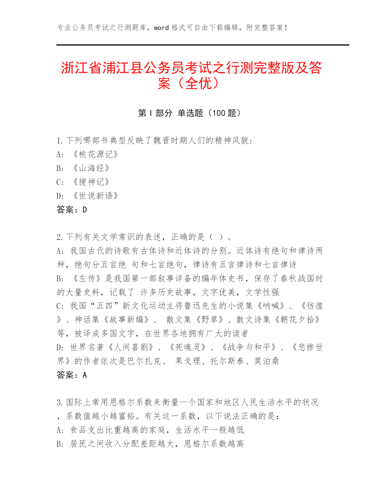 专业公务员考试之行测题库,word格式可自由下载编辑,附完整答案!浙江省浦江县公务员考试之行测完整版及答案(全优)第I部分单选题(100题)1.下列哪部书典型反映了魏晋时期人们的精神风貌:A:《桃花源记》B:《山海经》C:《搜神记》D:《世说新语》答案:D2.下列有关文学常识的表述,正确的是()。A:我国古代的诗歌有古体诗和近体诗的分别。近体诗有绝句和律诗两种,绝句分五言绝句和七言绝句,律诗有五言律诗和七言律诗B:《左传》是我国第一部叙事详备的编年体史书,保存了春秋战国时的大量史料,记载了许多历史故事,文