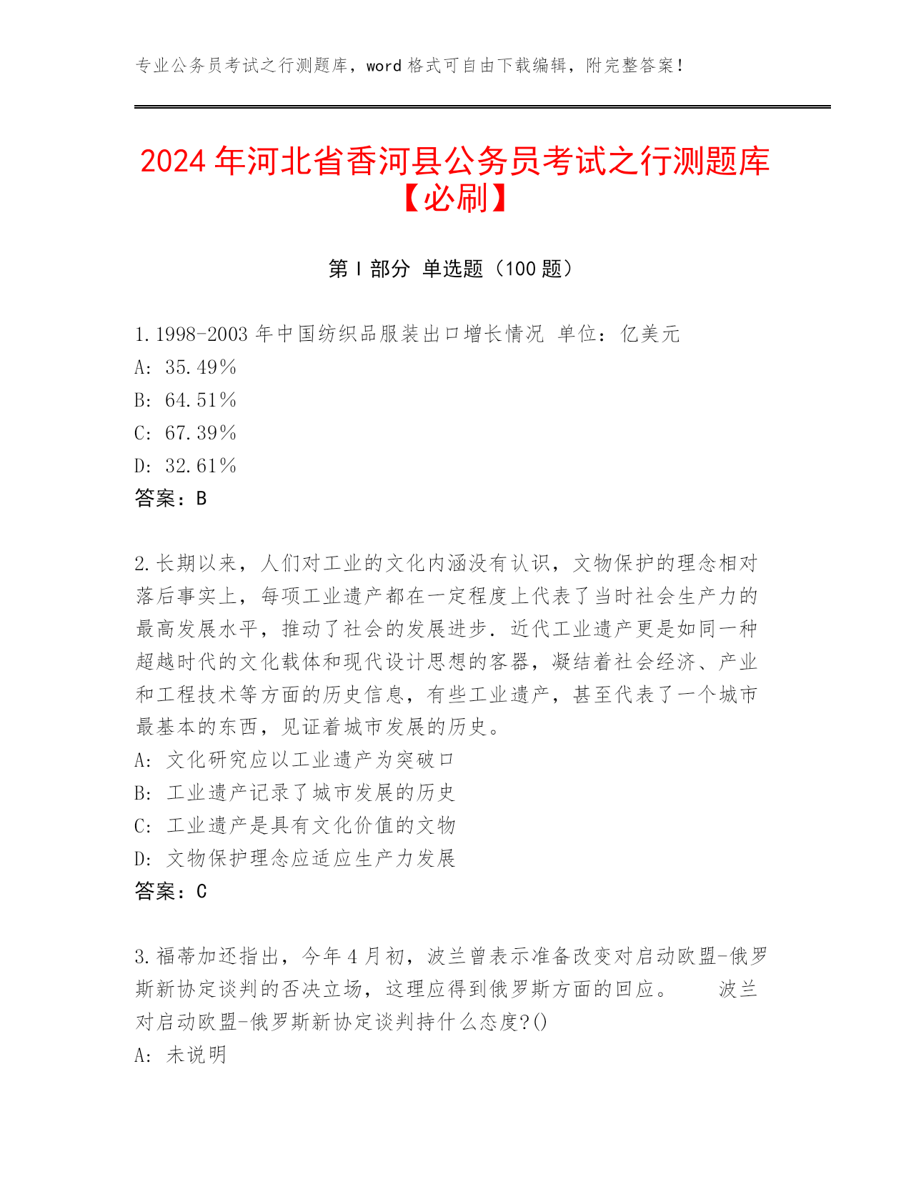 专业公务员考试之行测题库,word格式可自由下载编辑,附完整答案!2024年河北省香河县公务员考试之行测题库【必刷】第I部分单选题(100题)1.1998-2003年中国纺织品服装出口增长情况单位:亿美元A:35.49%B:64.51%C:67.39%D:32.61%答案:B2.长期以来,人们对工业的文化内涵没有认识,文物保护的理念相对落后事实上,每项工业遗产都在一定程度上代表了当时社会生产力的最高发展水平,推动了社会的发展进步.近代工业遗产更是如同一种超越时代的文化载体和现代设计思想的客器,凝结着社会经
