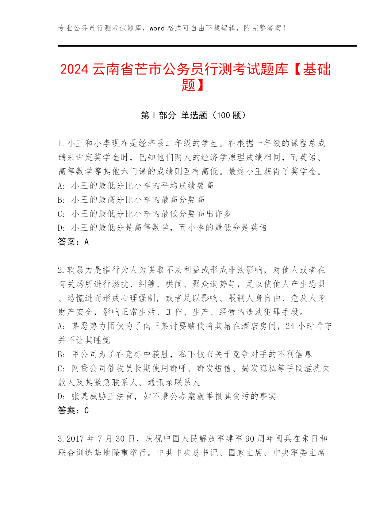 2024云南省芒市公务员行测考试题库【基础题】.docx