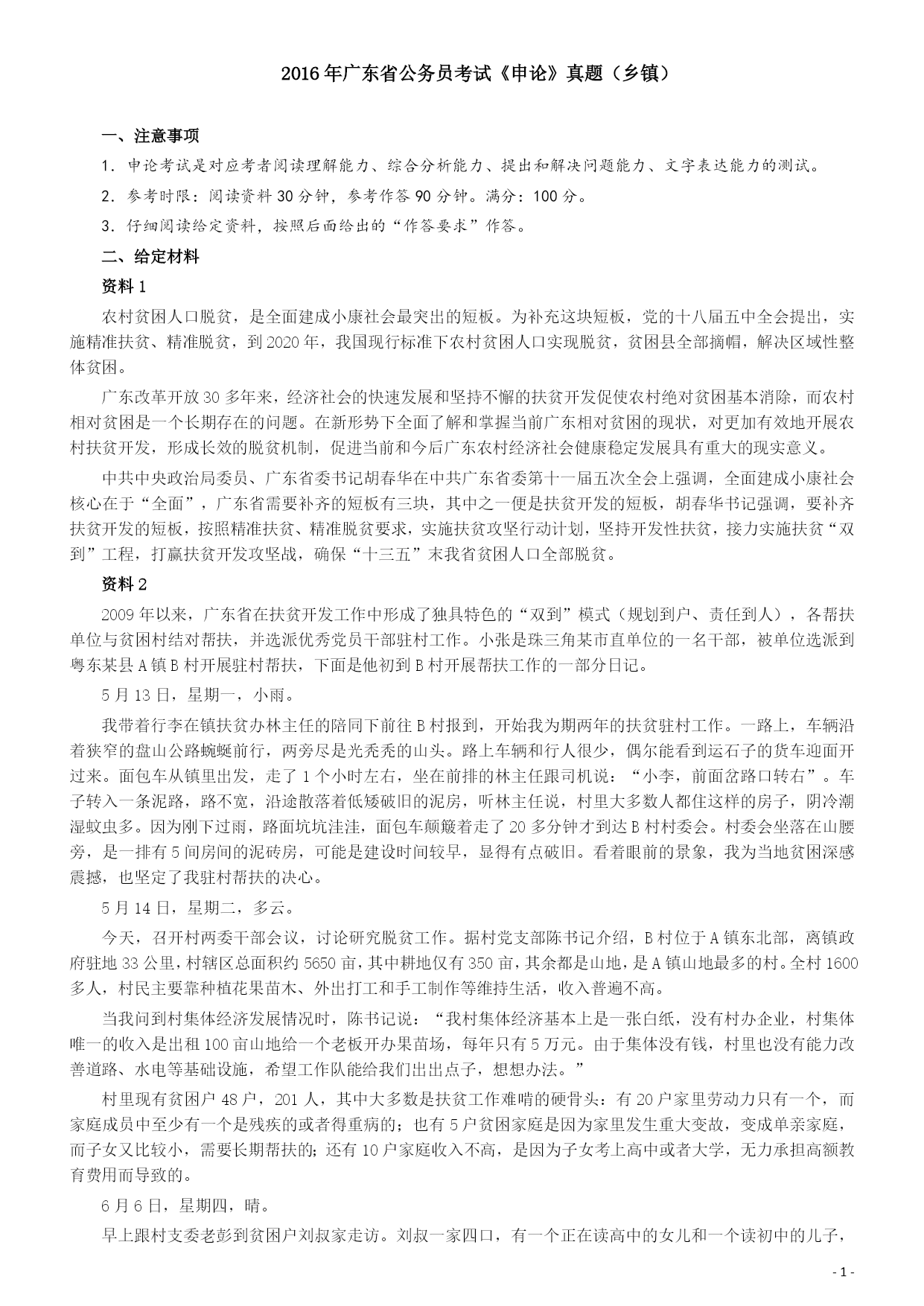 PAGE\*MERGEFORMAT-15-2016年广东省公务员考试《申论》真题(乡镇)一、注意事项1.申论考试是对应考者阅读理解能力、综合分析能力、提出和解决问题能力、文字表达能力的测试。2.参考时限:阅读资料30分钟,参考作答90分钟。满分:100分。3.仔细阅读给定资料,按照后面给出的“作答要求”作答。二、给定材料资料1农村贫困人口脱贫,是全面建成小康社会最突出的短板。为补充这块短板,党的十八届五中全会提出,实施精准扶贫、精准脱贫,到2020年,我国现行标准下农村贫困人口实现脱贫,贫困县全部摘