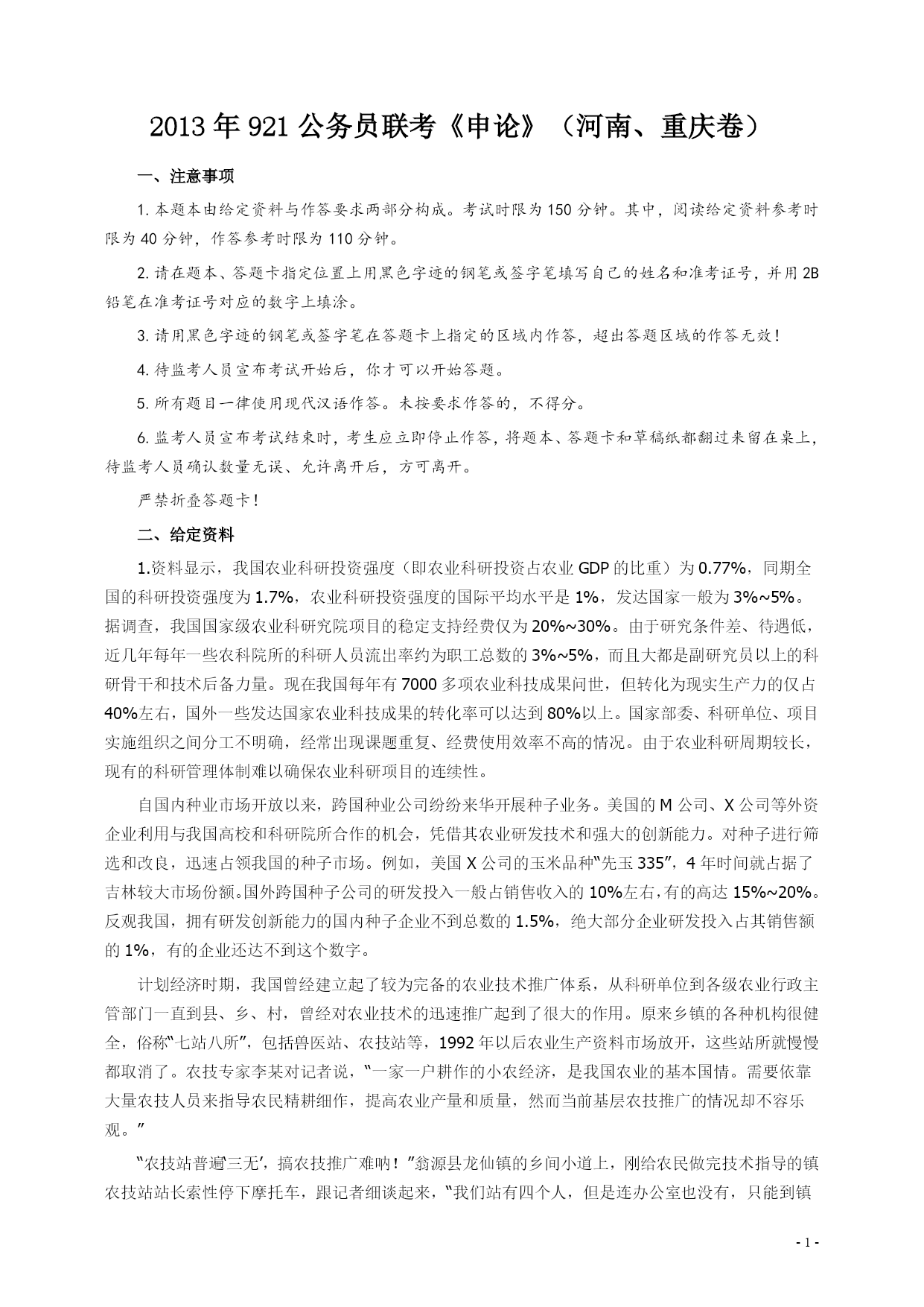 2013年921公务员考试联考《申论》真题(河南、重庆卷)及参考答案.doc