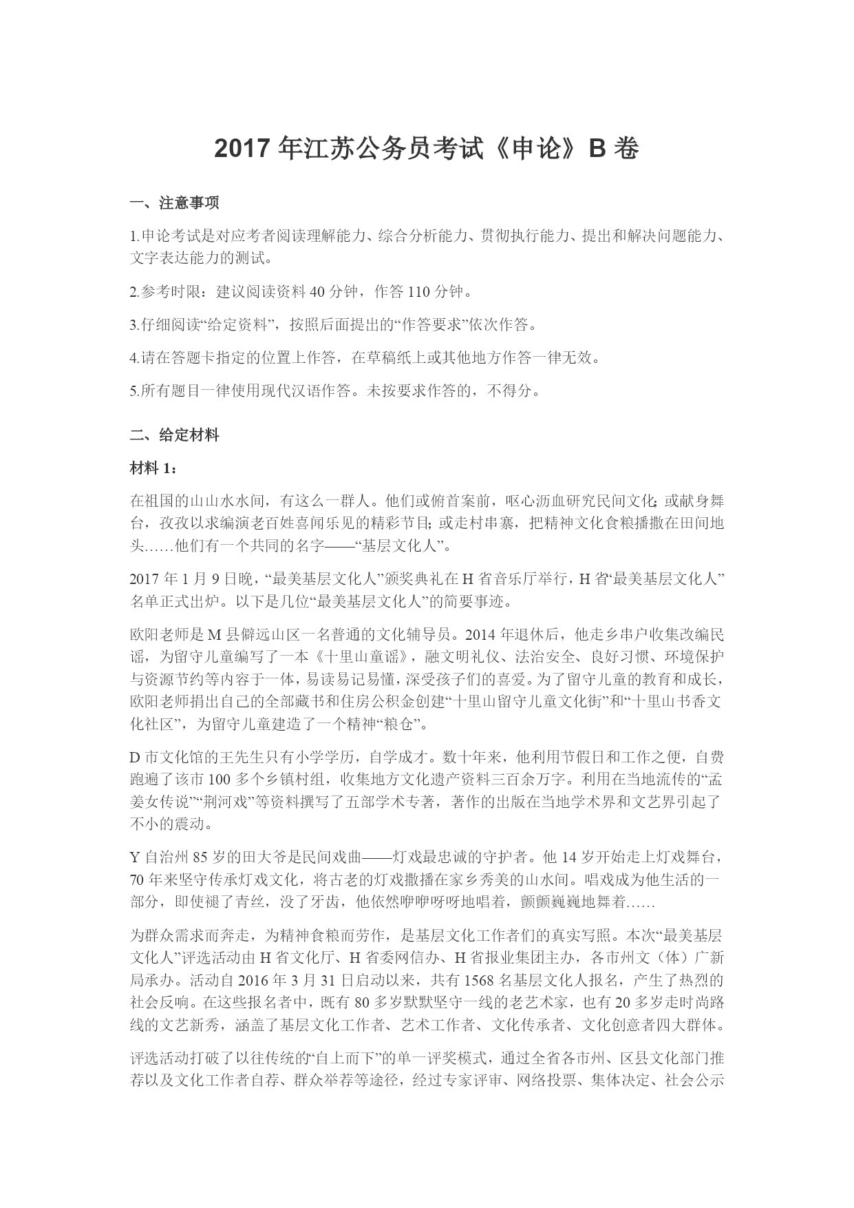 2017年江苏公务员考试《申论》B卷一、注意事项1.申论考试是对应考者阅读理解能力、综合分析能力、贯彻执行能力、提出和解决问题能力、文字表达能力的测试。2.参考时限:建议阅读资料40分钟,作答110分钟。3.仔细阅读“给定资料”,按照后面提出的“作答要求”依次作答。4.请在答题卡指定的位置上作答,在草稿纸上或其他地方作答一律无效。5.所有题目一律使用现代汉语作答。未按要求作答的,不得分。二、给定材料材料1:在祖国的山山水水间,有这么一群人。他们或俯首案前,呕心沥血研究民间文化;或献身舞台,孜孜以求编演老百