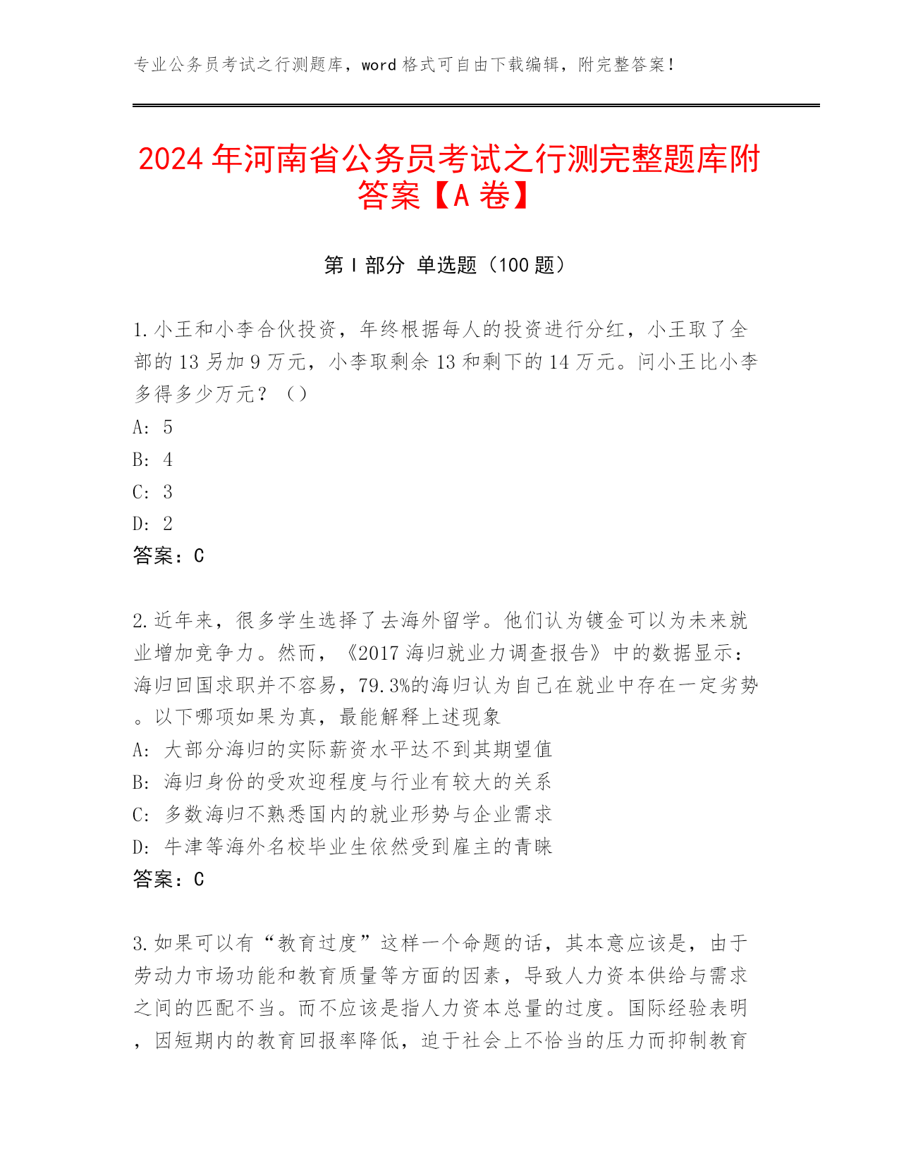 专业公务员考试之行测题库,word格式可自由下载编辑,附完整答案!2024年河南省公务员考试之行测完整题库附答案【A卷】第I部分单选题(100题)1.小王和小李合伙投资,年终根据每人的投资进行分红,小王取了全部的13另加9万元,小李取剩余13和剩下的14万元。问小王比小李多得多少万元?()A:5B:4C:3D:2答案:C2.近年来,很多学生选择了去海外留学。他们认为镀金可以为未来就业增加竞争力。然而,《2017海归就业力调查报告》中的数据显示:海归回国求职并不容易,79.3%的海归认为自己在就业中存在一定