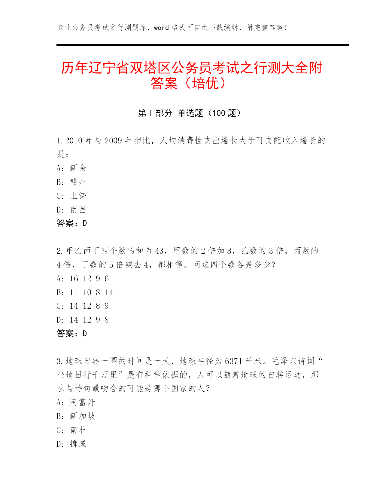 专业公务员考试之行测题库,word格式可自由下载编辑,附完整答案!历年辽宁省双塔区公务员考试之行测大全附答案(培优)第I部分单选题(100题)1.2010年与2009年相比,人均消费性支出增长大于可支配收入增长的是:A:新余B:赣州C:上饶D:南昌答案:D2.甲乙丙丁四个数的和为43,甲数的2倍加8,乙数的3倍,丙数的4倍,丁数的5倍减去4,都相等。问这四个数各是多少?A:161296B:1110814C:141289D:141298答案:D3.地球自转一圈的时间是一天,地球半径为6371千米。毛泽东诗词