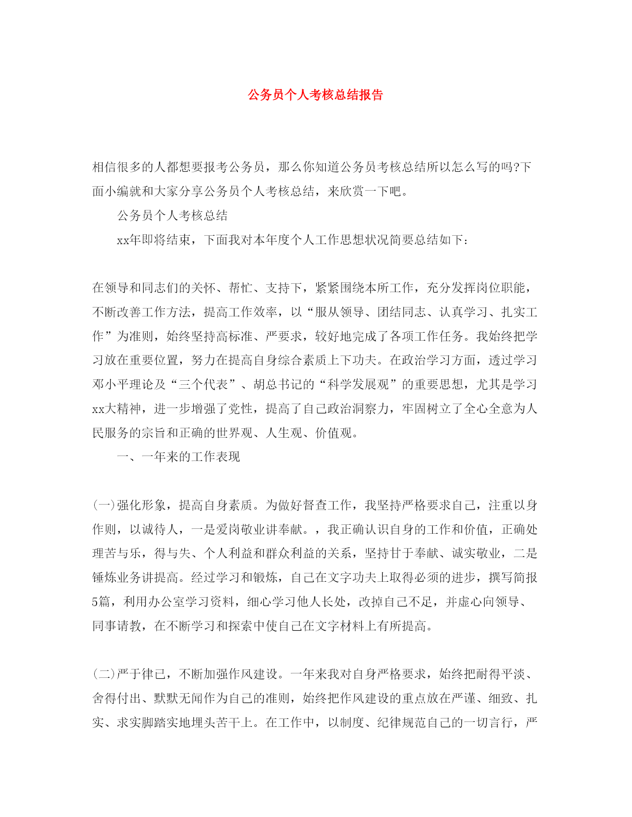 此资料由网络收集而来,如有侵权请告知上传者立即删除。资料共分享,我们负责传递知识。公务员个人考核总结报告相信很多的人都想要报考公务员,那么你知道公务员考核总结所以怎么写的吗?下面小编就和大家分享公务员个人考核总结,来欣赏一下吧。公务员个人考核总结xx年即将结束,下面我对本年度个人工作思想状况简要总结如下:在领导和同志们的关怀、帮忙、支持下,紧紧围绕本所工作,充分发挥岗位职能,不断改善工作方法,提高工作效率,以“服从领导、团结同志、认真学习、扎实工作”为准则,始终坚持高标准、严要求,较好地完成了各项工作任务