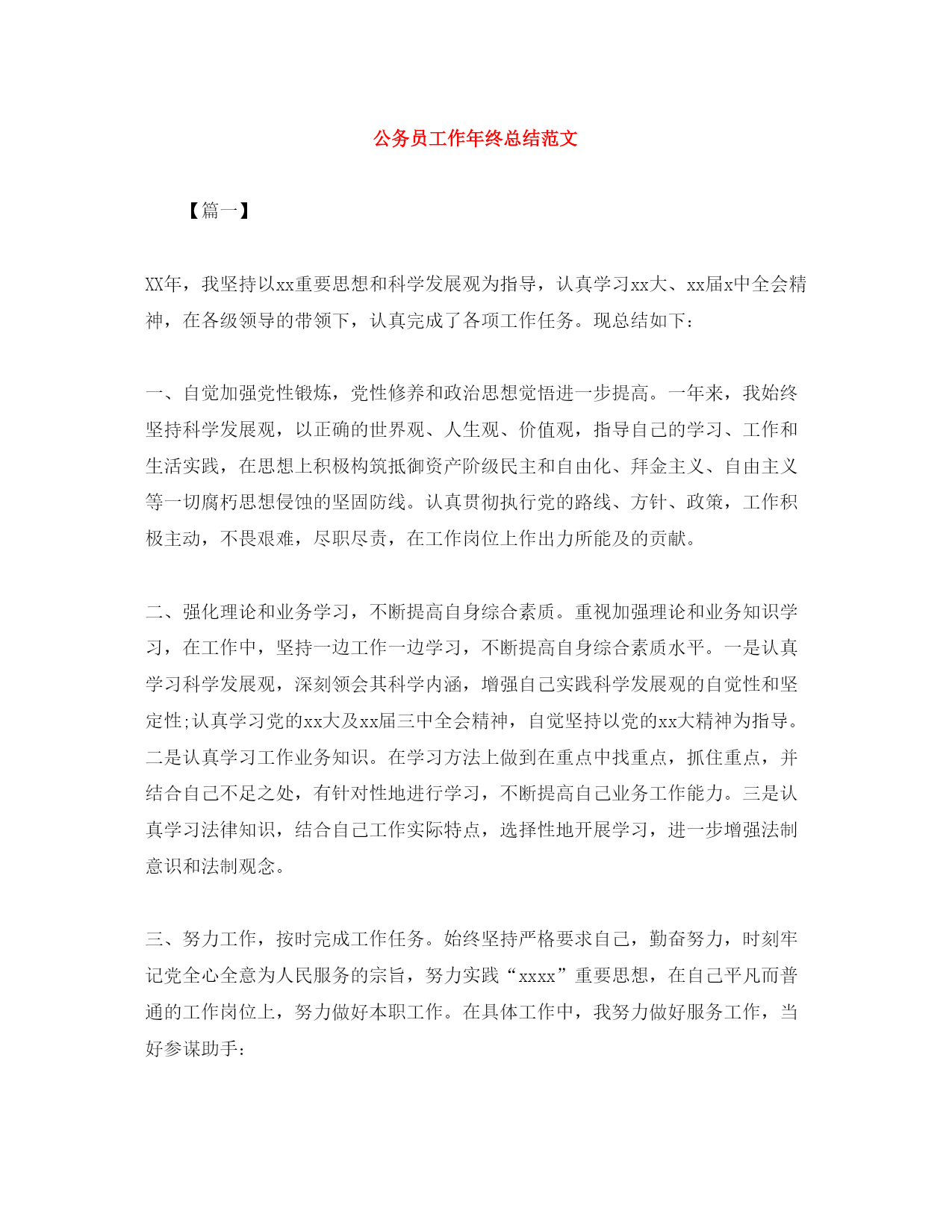 此资料由网络收集而来,如有侵权请告知上传者立即删除。资料共分享,我们负责传递知识。公务员工作年终总结范文【篇一】XX年,我坚持以xx重要思想和科学发展观为指导,认真学习xx大、xx届x中全会精神,在各级领导的带领下,认真完成了各项工作任务。现总结如下:一、自觉加强党性锻炼,党性修养和政治思想觉悟进一步提高。一年来,我始终坚持科学发展观,以正确的世界观、人生观、价值观,指导自己的学习、工作和生活实践,在思想上积极构筑抵御资产阶级民主和自由化、拜金主义、自由主义等一切腐朽思想侵蚀的坚固防线。认真贯彻执行党的路