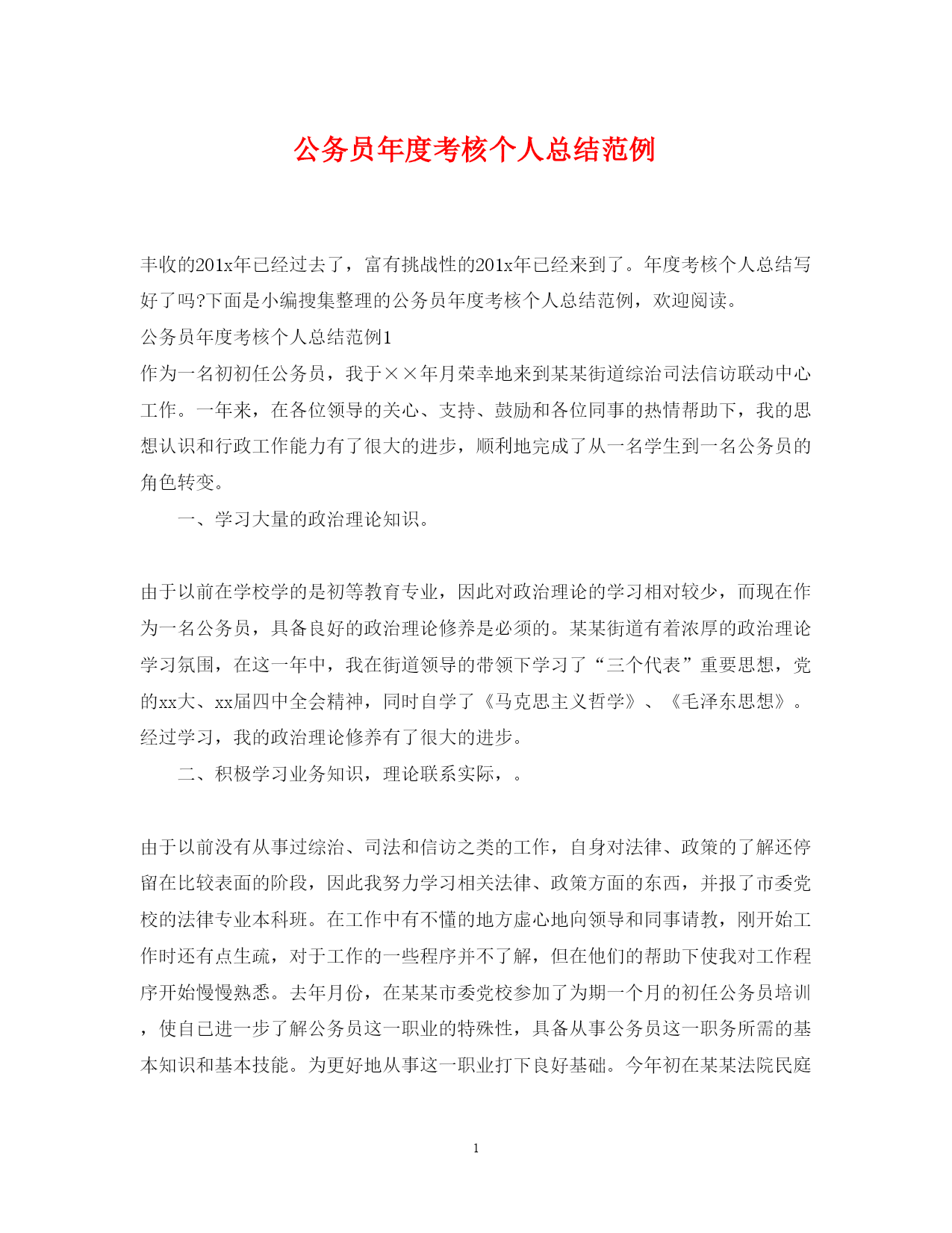此资料由网络收集而来,如有侵权请告知上传者立即删除。资料共分享,我们负责传递知识。PAGEPAGE4公务员年度考核个人总结范例丰收的201x年已经过去了,富有挑战性的201x年已经来到了。年度考核个人总结写好了吗?下面是小编搜集整理的公务员年度考核个人总结范例,欢迎阅读。公务员年度考核个人总结范例1作为一名初初任公务员,我于××年月荣幸地来到某某街道综治司法信访联动中心工作。一年来,在各位领导的关心、支持、鼓励和各位同事的热情帮助下,我的思想认识和行政工作能力有了很大的进步,顺利地完成了从一名