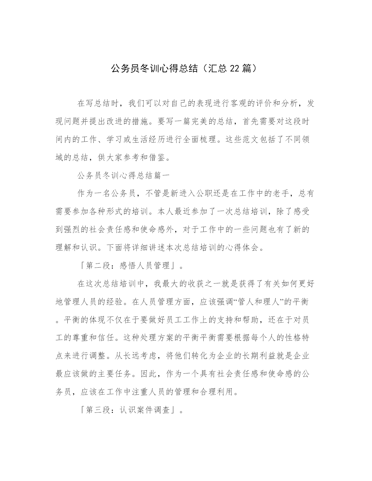 公务员冬训心得总结(汇总22篇)在写总结时,我们可以对自己的表现进行客观的评价和分析,发现问题并提出改进的措施。要写一篇完美的总结,首先需要对这段时间内的工作、学习或生活经历进行全面梳理。这些范文包括了不同领域的总结,供大家参考和借鉴。公务员冬训心得总结篇一作为一名公务员,不管是新进入公职还是在工作中的老手,总有需要参加各种形式的培训。本人最近参加了一次总结培训,除了感受到强烈的社会责任感和使命感外,对于工作中的一些问题也有了新的理解和认识。下面将详细讲述本次总结培训的心得体会。「第二段:感悟人员管理」。