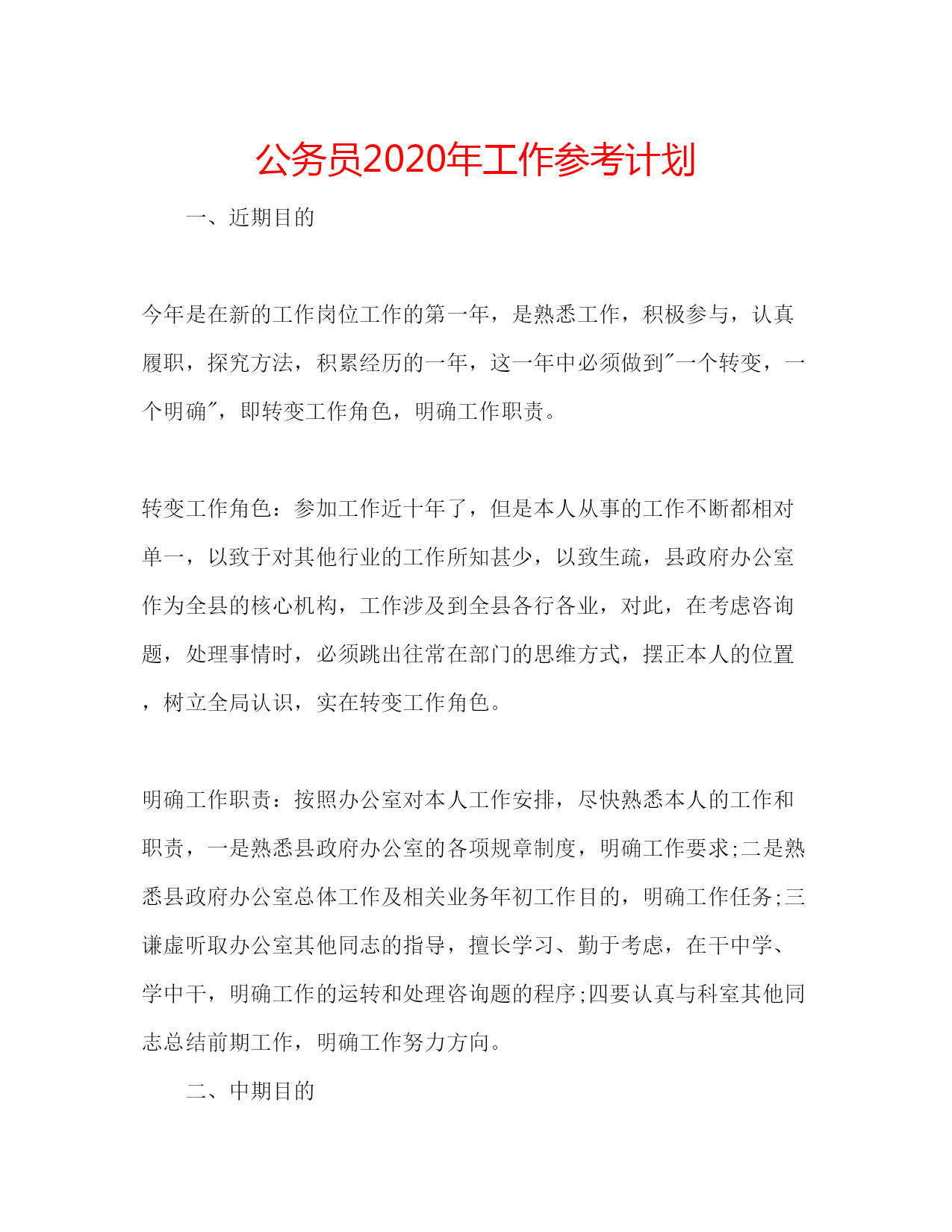 公务员2020年工作参考计划一、近期目的今年是在新的工作岗位工作的第一年,是熟悉工作,积极参与,认真履职,探究方法,积累经历的一年,这一年中必须做到"一个转变,一个明确",即转变工作角色,明确工作职责。转变工作角色:参加工作近十年了,但是本人从事的工作不断都相对单一,以致于对其他行业的工作所知甚少,以致生疏,县政府办公室作为全县的核心机构,工作涉及到全县各行各业,对此,在考虑咨询题,处理事情时,必须跳出往常在部门的思维方式,摆正本人的位置,树立全局认识,实在转变工作角色。明确工作职责:按照办公室对本人工作
