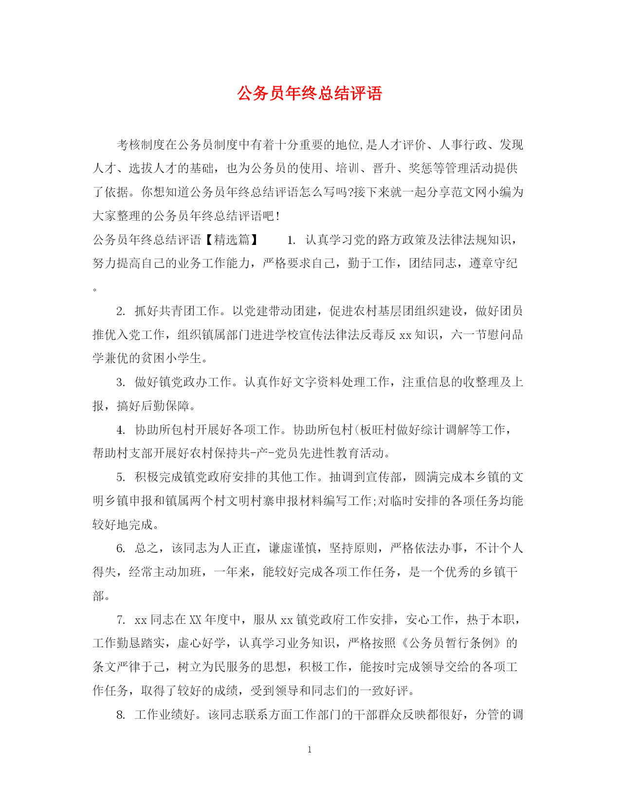 此资料由网络收集而来,如有侵权请告知上传者立即删除。资料共分享,我们负责传递知识。PAGEPAGE7公务员年终总结评语考核制度在公务员制度中有着十分重要的地位,是人才评价、人事行政、发现人才、选拔人才的基础,也为公务员的使用、培训、晋升、奖惩等管理活动提供了依据。你想知道公务员年终总结评语怎么写吗?接下来就一起分享范文网小编为大家整理的公务员年终总结评语吧!公务员年终总结评语【精选篇】1.认真学习党的路方政策及法律法规知识,努力提高自己的业务工作能力,严格要求自己,勤于工作,团结同志,遵章守纪